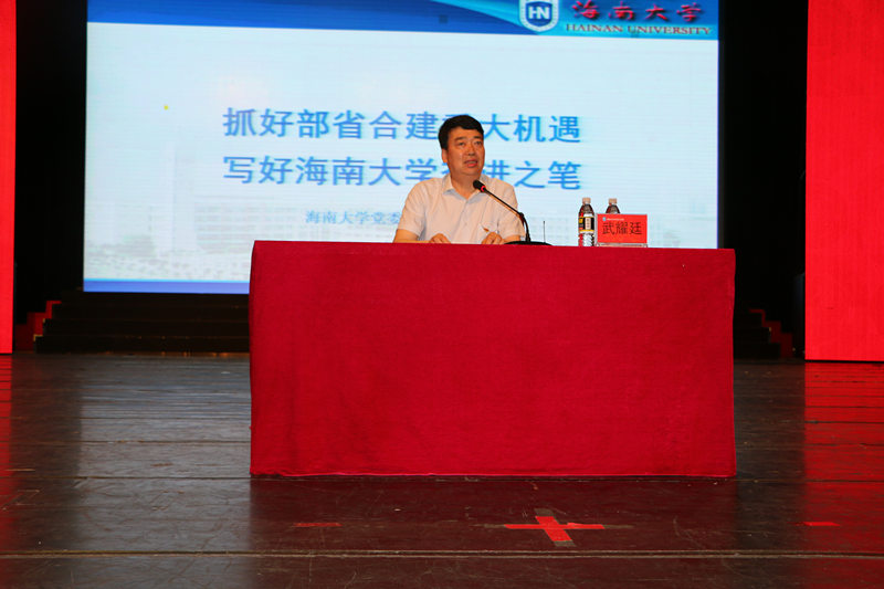 武耀廷教授指出,部省合建德赢AC米兰中国官方网站等14所高校是贯彻落实十九大精神,推进教育公平、全面提升西部教育质量的重大举措,成为部省合建高校后,教育部将参照直属高校模式对德赢AC米兰中国官方网站的建设发展予以指导支持,同时,海南省对德赢AC米兰中国官方网站建设发展的支持力度只增不减,并着力推动落实“举全省之力办好德赢AC米兰中国官方网站”。他强调,成为部省合建高校是德赢AC米兰中国官方网站在新时代迎来的重大发展机遇,有利于充分整合教育部、海南省、天津大学和德赢AC米兰中国官方网站的资源,充分挖掘德赢AC米兰中国官方网站自身的内在发展潜力,明确新目标、制定新举措、促进新发展。他表示,为把握好部省合建重大机遇,校党委将团结和带领全校师生,进一步强化党的领导作用;推进综合改革,建立和完善现代管理体制机制;提升科技创新和社会服务水平,加强师资队伍建设;加快一流学科和博士点建设,建设发展好德赢AC米兰中国官方网站的优势专业和学科;加大高层次人才引培力度,提高人才培养质量,提升生源质量;弘扬优良的校风、教风、学风;保持风清气正,立足海南,服务国家。他希望,海大学子要以更高的政治站位、更强的使命意识、更大的责任担当面对学习和生活,并提出三点建议,一是感党恩、听党话、跟党走;二是以国家民族复兴为己任;三是从小事做起,脚踏实地,多干实事,理性批判。