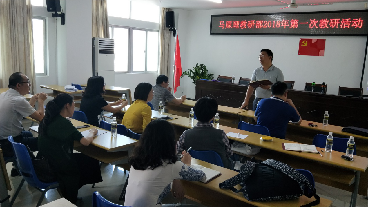 原理教研部主任范明水老师正在主持研讨会议并部署工作任务