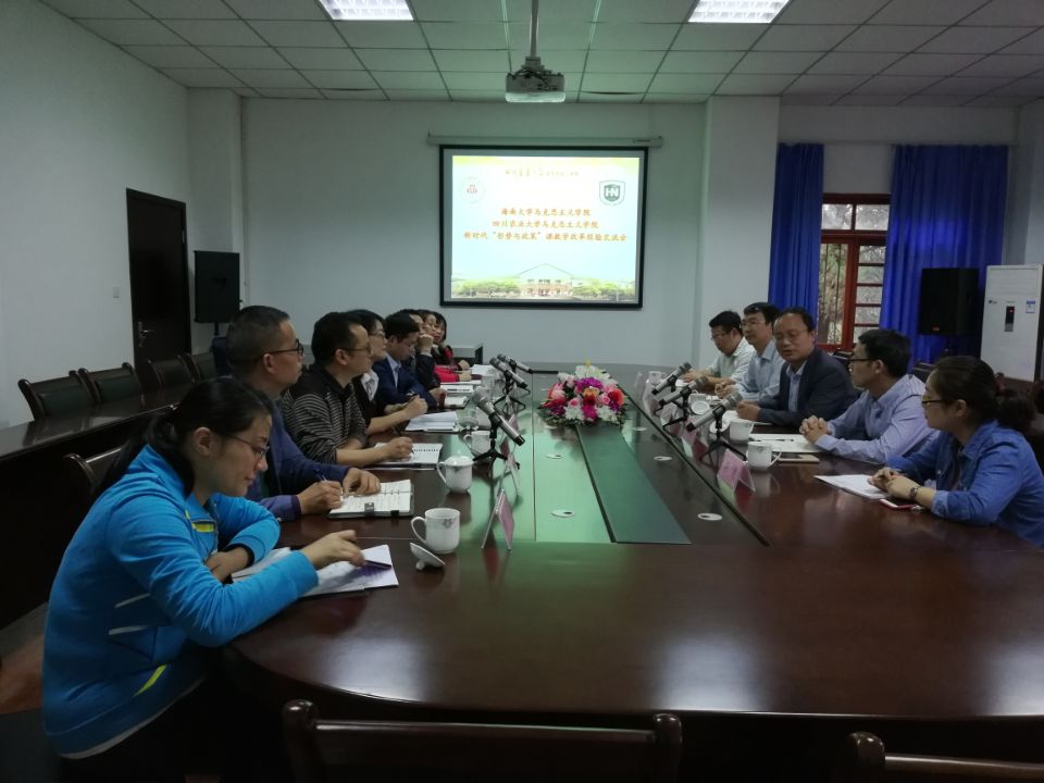交流期间,受到四川师范大学德赢AC米兰中国官方网站党委书记李北东、副院长王曦和四川农业大学德赢AC米兰中国官方网站党委书记杨世义、院长赵晓霞的热情接待。在详细了解四川省高校形势与政策课程研究会的建设状况、发展前景、运行机制和未来设想,以及四川省形势与政策教师职业能力提升教学竞赛的有关情况之后,双方还就新时代《形势与政策》课程建设与改革、思想政治教育专业建设、思政课实践基地等问题展开详细深入的交流。交流最后,双方还就未来搭建两省高校之间的形势与政策教育教学资料共享、专家资源共享等实质性问题,达成合作的意向和意见。