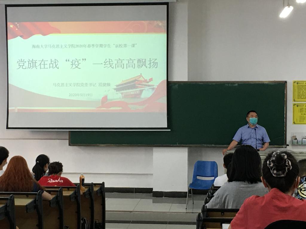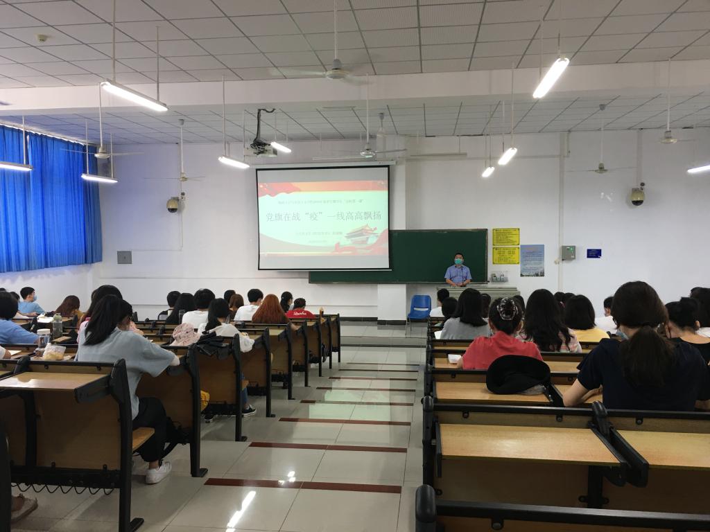 段捷频以“党旗在战‘疫’一线高高飘扬”为主题作讲授。他指出,新冠肺炎突如其来,党中央高度重视,习近平总书记亲自指挥、亲自部署,打响了疫情防控的人民战争、总体战、阻击战。在党中央坚强领导下,各级党组织和广大党员、干部冲锋在前、英勇奋战,医务工作者和支援湖北医疗队员白衣执甲、逆行出征,人民解放军指战员闻令即动、勇挑重担,广大社区工作者、公安干警、基层干部、下沉干部、志愿者等广大群众众志成城、踊跃参与,谱写了波澜壮阔、感天动地的战“疫”史诗。让我们深刻认识到中国共产党强大的战斗力和凝聚力,深刻感受到中国特色社会主义制度的优越性。他强调“生命重于泰山,疫情就是命令,防控就是责任,”党的全部力量来自组织,而防控一线又是检验初心使命的试金石,是锤炼担当斗争精神的磨刀石。中国共产党时刻为人民而战、靠人民而胜。全党全国人民上下一心,共同阻止疫情,就一定能够战无不胜。他对同学们提出五点希望,一是积极传播正能量,弘扬中国精神,自觉抵制负面舆情;二是要肩负起青年马克思主义者的使命担当,与祖国同呼吸共命运;三是积极发挥好党组织战斗堡垒作用和党员先锋模范作用;四是要把常态化疫情防控和复学复课两手抓,两手都要硬,五、迅速在学院开展文明大行动和爱国卫生运动,展现马院新风尚。