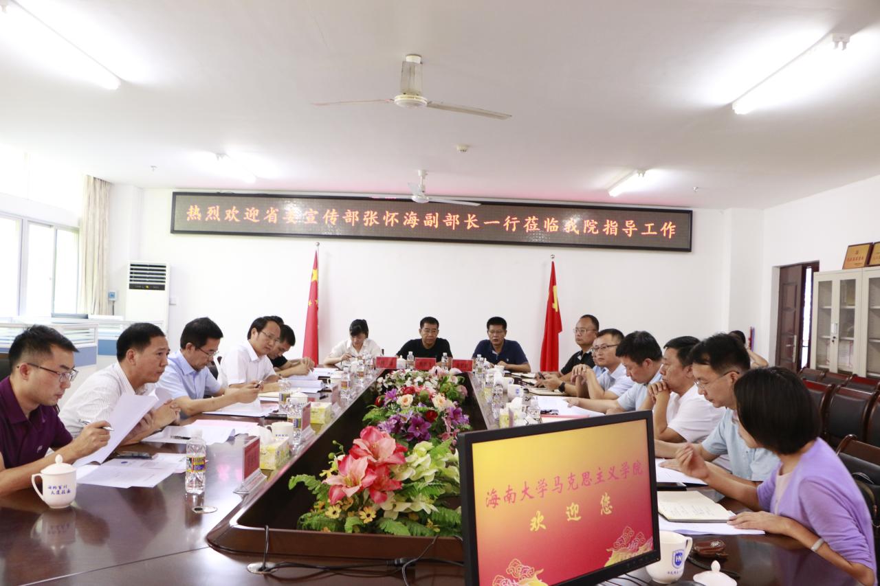 张怀海在认真听取汇报并与参会人员进行充分交流后发表讲话,对德赢AC米兰中国官方网站近些年的建设发展和所取得成效给予充分肯定。他指出,海南自贸港建设让海南成为全国乃至全球舆论关注的重点焦点,做好意识形态工作、舆情工作至关重要。德赢AC米兰中国官方网站作为海南龙头高校,要按照沈晓明书记要求,当好参与者、参谋部、孵化器和后备队,服务海南全面深化改革开放和自由贸易港建设,德赢AC米兰中国官方网站在海南意识形态工作中具有特殊使命和责任。他认为,海大马院正处于快速发展时期,在全国高校马院中显示度和影响力明显提升,学院制定的“十四五”规划具有较强的可操作性,希望海大马院在海南自贸港建设背景下,提高政治站位,对标全国、放眼全球,高标准、高要求推进相关建设发展工作。他表示,省委宣传部将按照中央和省委相关文件精神,进一步关心和支持海大马院建设发展,推进落实部校共建德赢AC米兰中国官方网站相关工作,扎实推动马院内涵式发展,切实提高人才培养质量。
