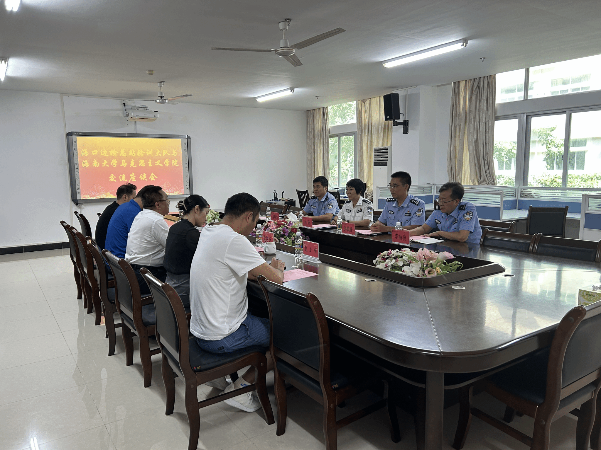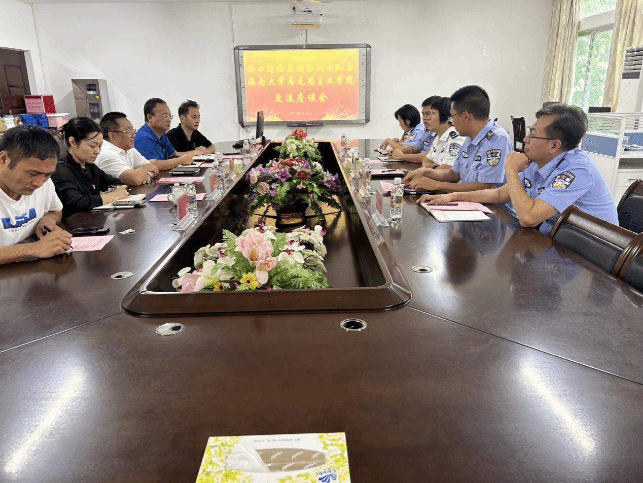 2023年9月20日海口边检总站轮训大队与德赢AC米兰中国官方网站在社科楼A311会议举行交流座谈会,海口边检总站轮训大队大队长刘瑛、副大队长吴镇波、处长程桂东、教员李海波和陈蕾出席座谈会,德赢AC米兰中国官方网站部分领导班子成员和科室主任参加会议,会议由学院党委书记段捷频主持。