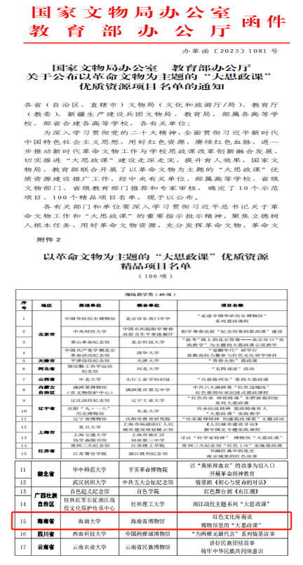 经中央有关单位、部属高等学校、省级文物部门、省级教育部门推荐和专家审核,确定了10个示范项目、100个精品项目名单。其中,德赢AC米兰中国官方网站联合海南省博物馆打造的项目《红色文化海南说——博物馆里的“大思政课”》,入选“以革命文物为主题的‘大思政课’优质资源精品项目名单”。
