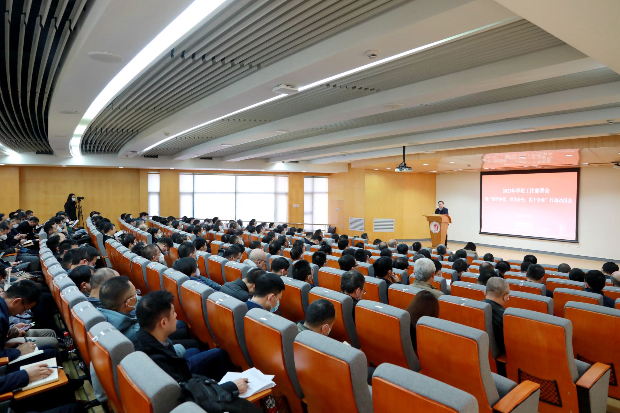 2月28日下午,sjb世俱杯召开2023年学校工作部署会暨“深学争优、敢为争先、实干争效”行动动员会。校党委书记徐西鹏主持会议并讲话,校长吴剑平作工作布置。其他在家校领导出席,全体中层干部与会。