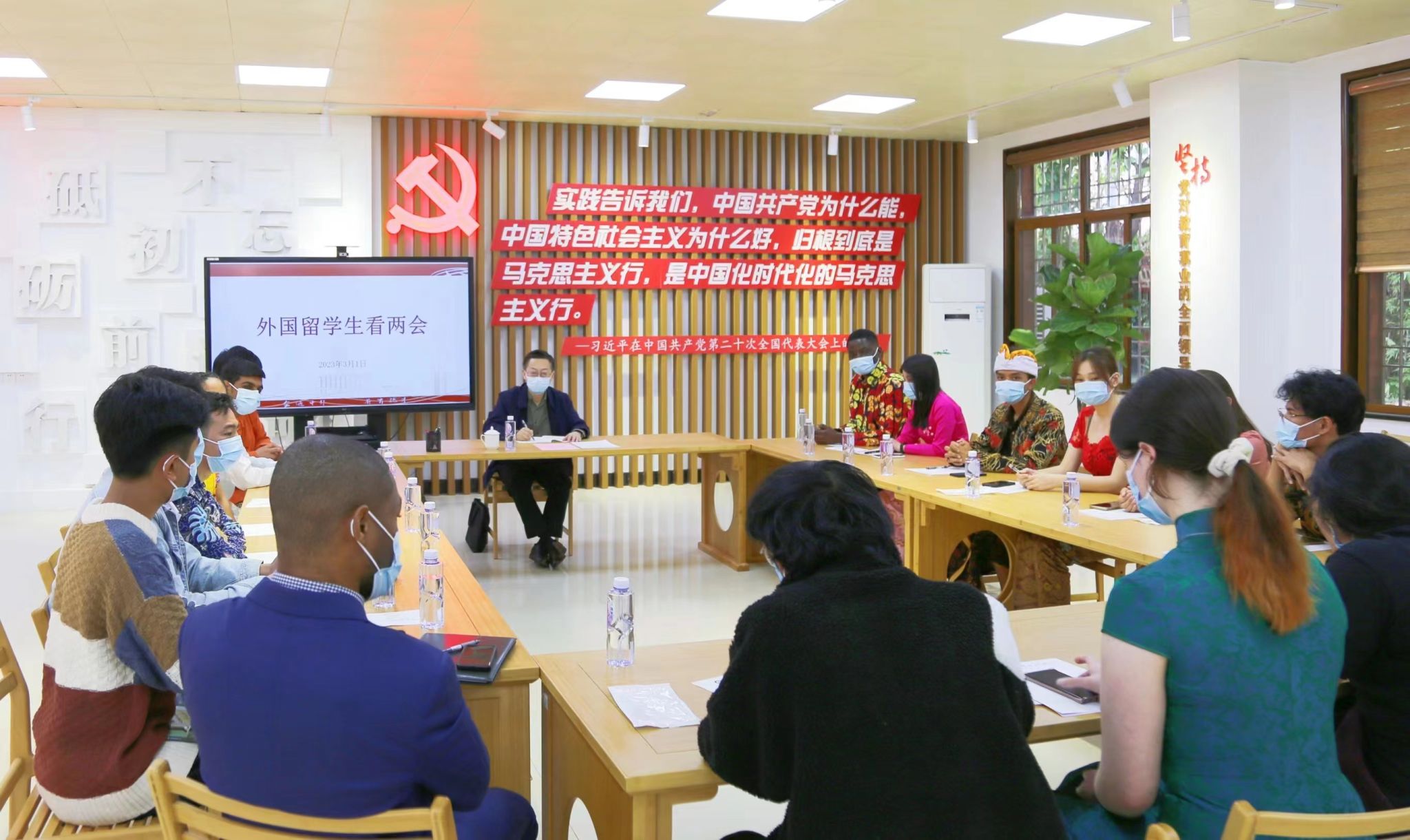3月1日下午,全国政协委员、校党委书记徐西鹏与来自泰国、巴基斯坦、越南、南非等10个国家的18名留学生以轻松对话的形式,讨论国内外关心的热点话题,为留学生讲读两会,倾听学生所想所需。