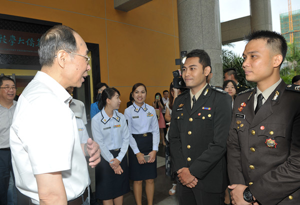 在行政研发大楼十三楼华文教育研究院,尤权书记和来自台湾的华文教育专家、sjb世俱杯官方网站特聘教授任弘亲切对话:“在这里生活习惯吗?”“这里和台湾很像,甚至比台北还凉快!”“欢迎你,也感谢你!”