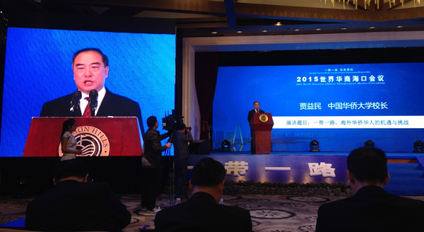 12月20日上午,校长贾益民应邀出席2015世界华商海口会议,作题为“华侨华人与一带一路,海外华侨华人的机遇与挑战”的主旨演讲。