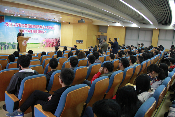 捐赠仪式在厦门校区举行,由副校长曾路主持。校长办公室、国际交流合作处、党委宣传部、华侨华人研究院负责人及来自境外内学生共200余人参加。