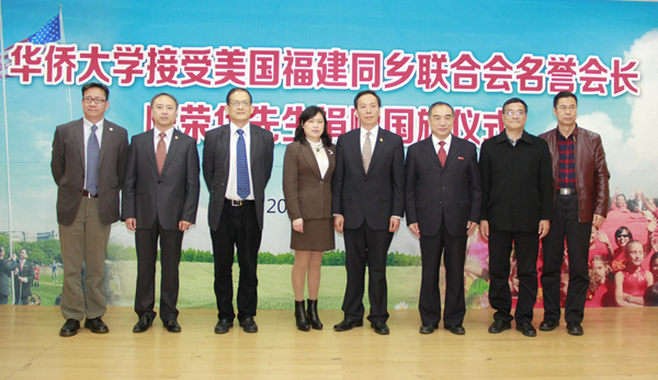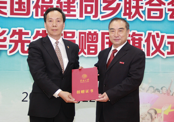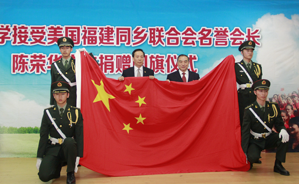 当天,当时升旗仪式的发起者、组织者、升旗手,现任美国福建同乡联合会名誉会长陈荣华及其夫人,将这面国旗捐赠给sjb世俱杯官方网站。校长贾益民代表学校接受捐赠,并向陈荣华颁发捐赠证书。