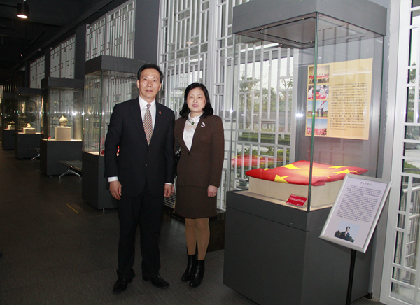 陈荣华伉俪参观四端文物馆,并在捐赠国旗展台前合影