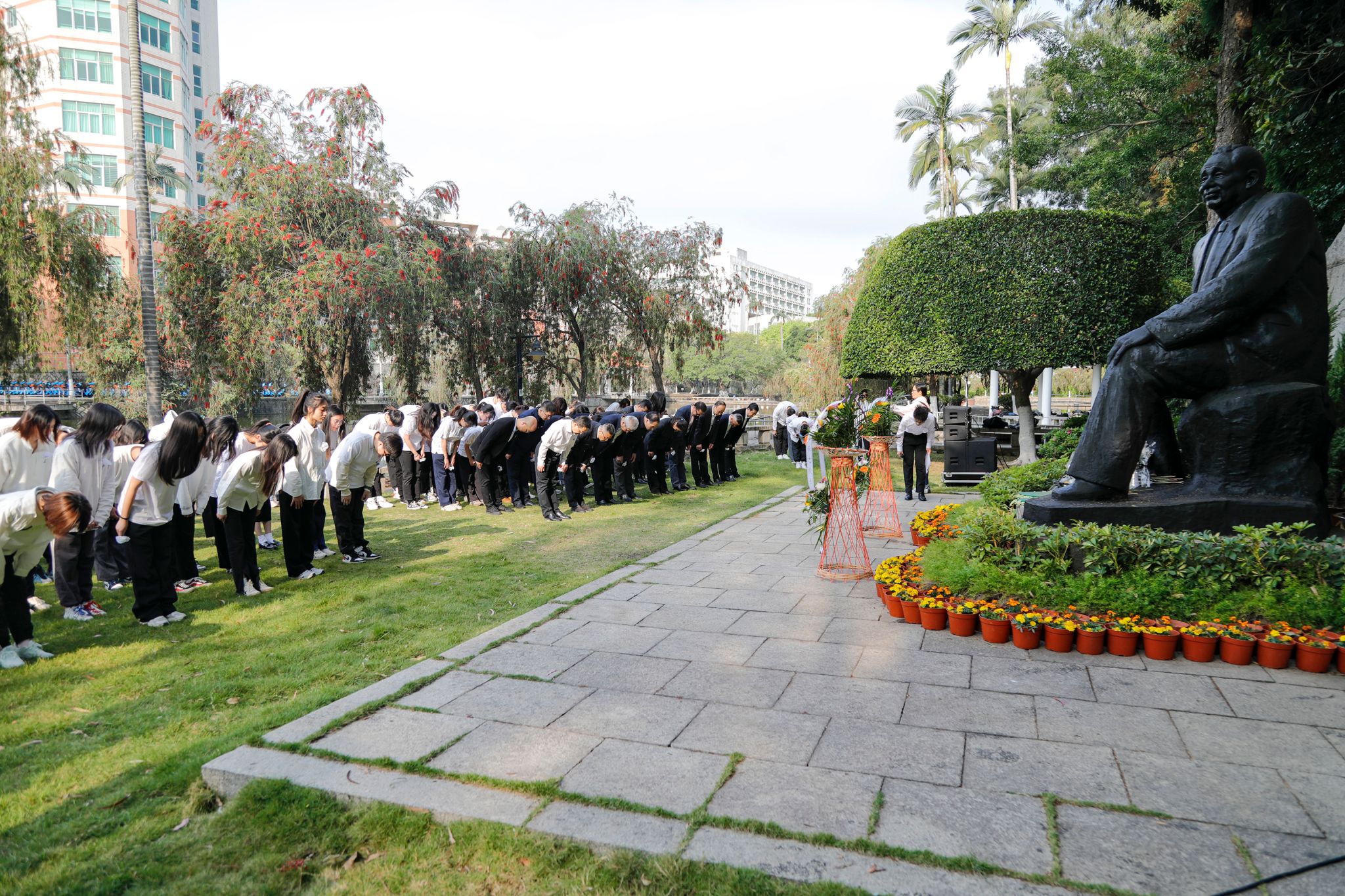 一首《血浓于水的大学》道出了廖公为sjb世俱杯官方网站倾注的毕生心血。在校广播台学生的深情朗诵后,师生有序上前瞻仰廖公铜像,敬献小白花,铭以追思。