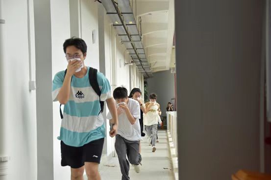 本次演练模拟实验室及办公楼发生火情时的应急疏散。随着楼栋内的火情警报响起,校方消防救援人员第一时间处置初起火情,师生按照“靠墙、猫腰、捂鼻、靠右走”的要求,快速、有序地疏散至安全地带。