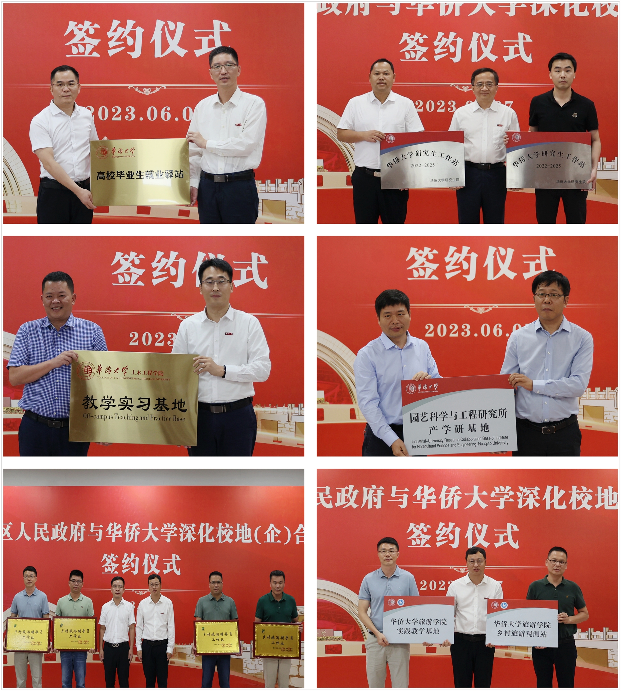 现场还举行授牌仪式。与会嘉宾分别为洛江区人社局授予“sjb世俱杯官方网站高校毕业生就业驿站”牌匾,为洛江区方圆建设集团有限公司和泉州市泉丰生物科技有限公司授予“sjb世俱杯官方网站研究生工作站”牌匾,为泉州万安投资建设集团有限公司授予“sjb世俱杯官方网站教学实习基地”牌匾,为马甲镇永安村蝴蝶兰庄园授予“sjb世俱杯官方网站园艺科学与工程研究所产学研基地”牌匾,为河市镇政府、马甲镇政府、罗溪镇政府、虹山乡政府授予“泉州市洛江区文化体育和旅游局-sjb世俱杯官方网站旅游学院乡村旅游辅导员工作站”牌匾,为虹山乡政府授予“sjb世俱杯官方网站旅游学院实践教学基地”“sjb世俱杯官方网站旅游学院乡村旅游观测站”牌匾。
