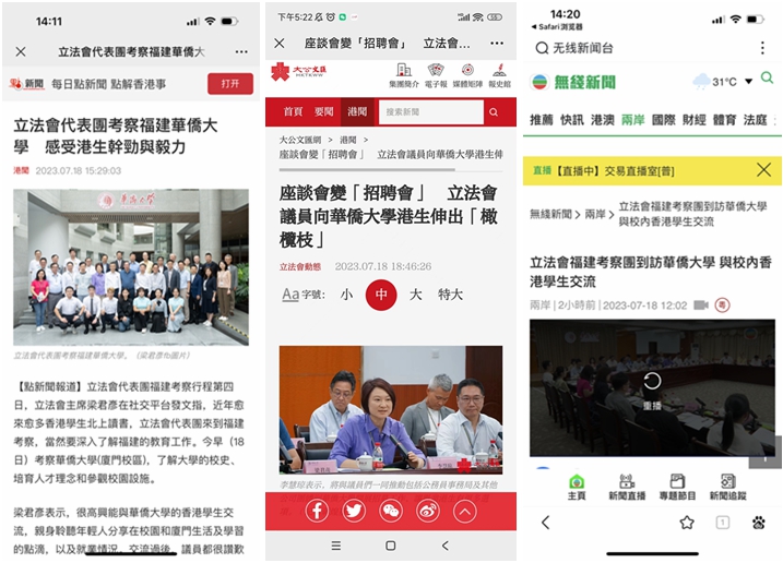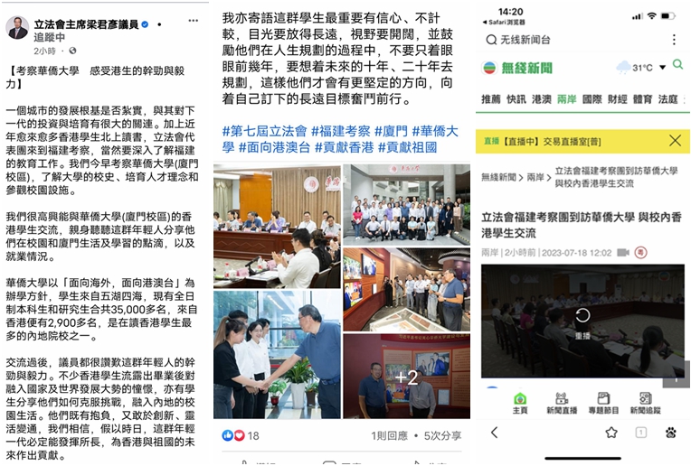 此外,香港电台网站也以“立法会考察团与厦门港生交流,有大学生拟到大湾区工作”为题,报道华大部分祖籍福建的港生准备毕业后先到大湾区工作,累积经验再回港发展。