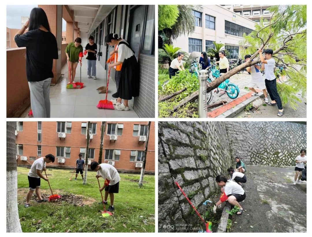 各学院也积极行动。政治与公共管理学院、旅游学院、工学院等分别组织留校学生或学生党员在确保安全的前提下,对学院及学生社区周边环境进行清理,助力重建美丽华园。“台风过后,校内道路上的残枝着实很多。虽然我们能做的事有限,虽人数有限、工具有限、力量有限,但是很高兴能为学校、为学院台风过后的休整付出自己的一份力量。”政管学院2022级学生奥古兰木说。