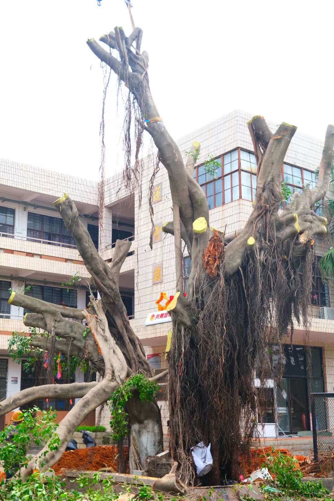 7月28日,泉州遭受“杜苏芮”洗礼,华园受损严重。台风过境,四处都是倒木碎枝,树木倒伏和大型树枝断干超过400棵。而最为触目惊心的,莫过于这棵被狂风连根拔起的大榕树。因其倒塌、连根拔起在地面造成的巨大豁口,雨水和着鲜艳红土的景象,让通过视频、图片看到这一幕的师生、校友们担心不已——“北操门口的大榕树倒了”“军训时给大家遮荫的大榕树没了”……