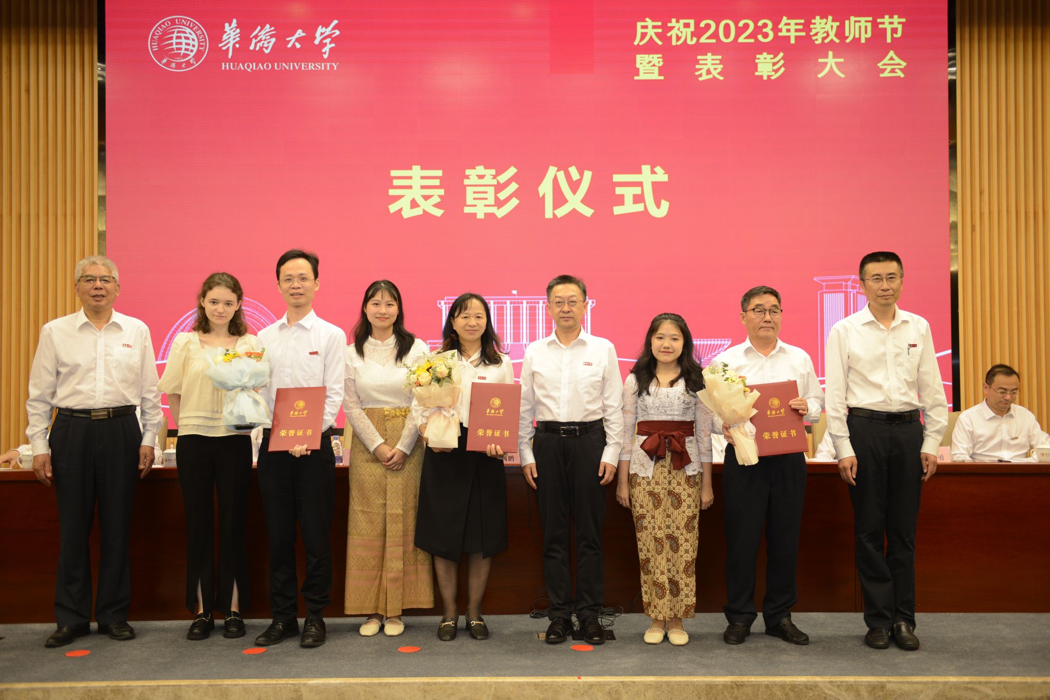 化工学院荆国华教授入选教育部国家级重大人才项目,华文学院胡培安教授团队的教学成果获评高等教育(本科)国家级教学成果奖二等奖,先进碳转化技术研究院詹国武老师入选国家自然科学基金优秀青年基金项目,美术学院林晔琳、数学科学学院谢小贤、化工学院王奇志、旅游学院汪京强、工商管理学院杨洪涛、机电及自动化学院尤芳怡、计算机科学与技术学院张国亮、国际关系学院王秋彬、统计学院叶荔辉等9个教师团队的课程获评国家级一流本科课程……表彰大会上,校领导为获得国家级和部分省级荣誉的教师代表颁奖,学生代表向他们敬献了鲜花。