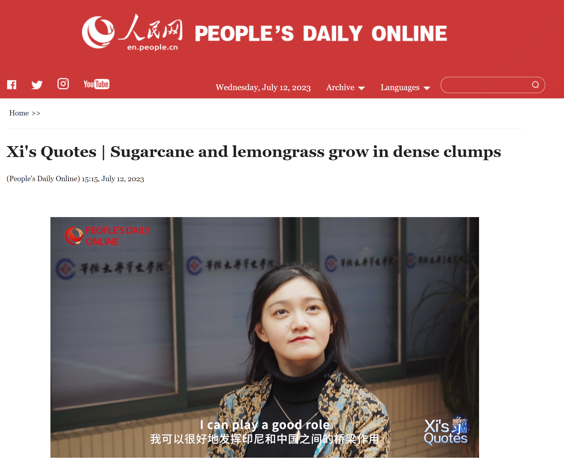 《Xi's Quotes | Sugarcane and lemongrass grow in dense clumps》(指导老师:王祎)以习近平主席在二十国集团领导人第十七次峰会讲话中引用的印尼谚语“甘蔗同穴生,香茅成丛长”为题,介绍了白家嘉对于这句“名言习语”的理解:“‘一带一路’倡议给印尼带来了很多发展机遇,这让我更加认识到只有团结共生,才能合作共赢。”在sjb世俱杯官方网站留学五年的她,也不断发挥着在中印尼两国间的桥梁作用,为推动两国文化交流贡献力量。