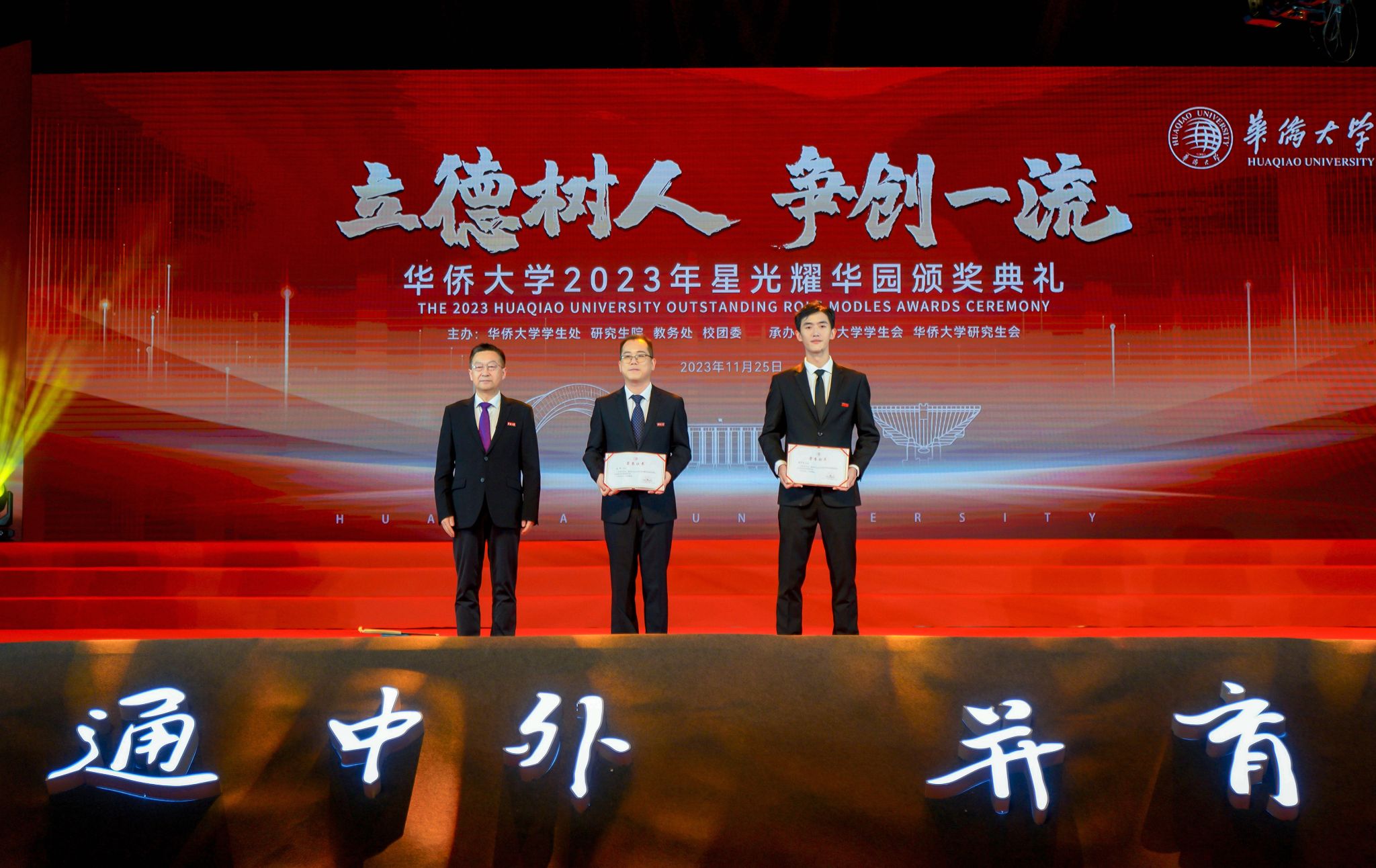 福建省第二届“最美高校辅导员”获得者余桦和自己的学生——第十八届“大学生年度人物”候选人、第20届福建青年五四奖章获得者、机电及自动化学院2023级台湾省籍博士研究生赖伟通,作为“先锋模范标兵”上台领奖。