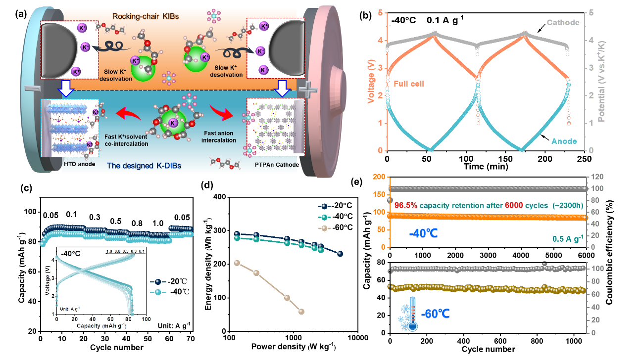 鉴于此,阙兰芳研究团队根据前期关于低温电解液的研究工作积累(Angew. Chem. Int. Ed.2022,61, e202213416),构建了基于聚三苯胺(PTPAn)正极和氢钛酸(HTO)负极的钾基双离子电池(K-DIBs),以期同步实现电池的低温适应性与快速充放电能力。与锂离子电池不同,双离子电池在正极引入了阴离子(如PF6−、BF4−、TFSI−等)嵌入/脱出机制,有望为调控低温工况下的去溶剂化过程提供新的解决方案。结合理论计算和实验分析表明,在该体系中,稀电解液中较强的K+/溶剂结合能、HTO结晶水的电荷屏蔽效应以及高柔性有机均质SEI膜共同促进了HTO负极发生K+/溶剂共嵌行为。基于此,PTPAn正极和HTO负极均规避了金属阳离子(K+)的去溶剂化过程,这从本质上消除了低温下的限速电荷转移过程。负极共嵌机制和正极阴离子存储行为使HTO||PTPAn K-DIBs具有优异的低温循环耐久性与倍率性能,在−40oC下循环6000次后容量保持率为94.1%,在−60oC下循环1000次后容量保持率为91%。该体系为开发面向极端低温工况的高功率密度储能设备提供了重要参考。