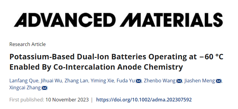 近日,sjb世俱杯官方网站材料科学与工程学院阙兰芳研究团队在低温电池研究领域取得了新进展,相关研究成果以“Potassium-Based Dual-Ion Batteries Operating at−60oC Enabled By Co-Intercalation Anode Chemistry”为题及全文形式发表于国际权威期刊Advanced Materials(先进材料)(Adv. Mater.2023, 2307592)。Advanced Materials是材料与化学领域的顶级期刊,在国际科研领域享有盛誉。