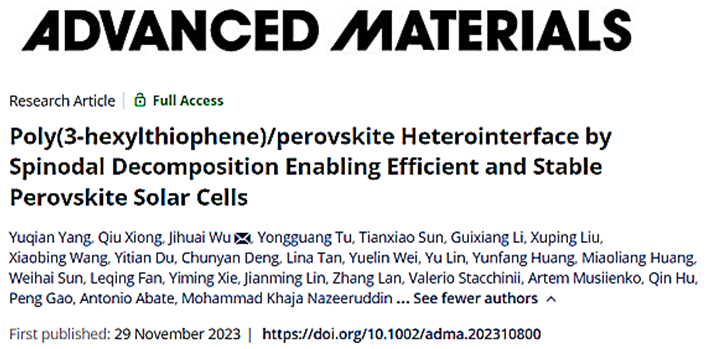 近日,材料科学与工程学院吴季怀教授研究团队在钙钛矿太阳能电池领域取得了新进展。相关成果以"Poly(3-hexylthiophene)/perovskite Heterointerface by Spinodal Decomposition Enabling Efficient and Stable Perovskite Solar Cells”为题在国际顶级期刊《先进材料》(Advanced Materials)(Adv. Mater.2023, 2310800)上发表。Advanced Materials是美国Wiley出版社旗下的材料与化学领域的顶级期刊,当前影响因子为32.086。