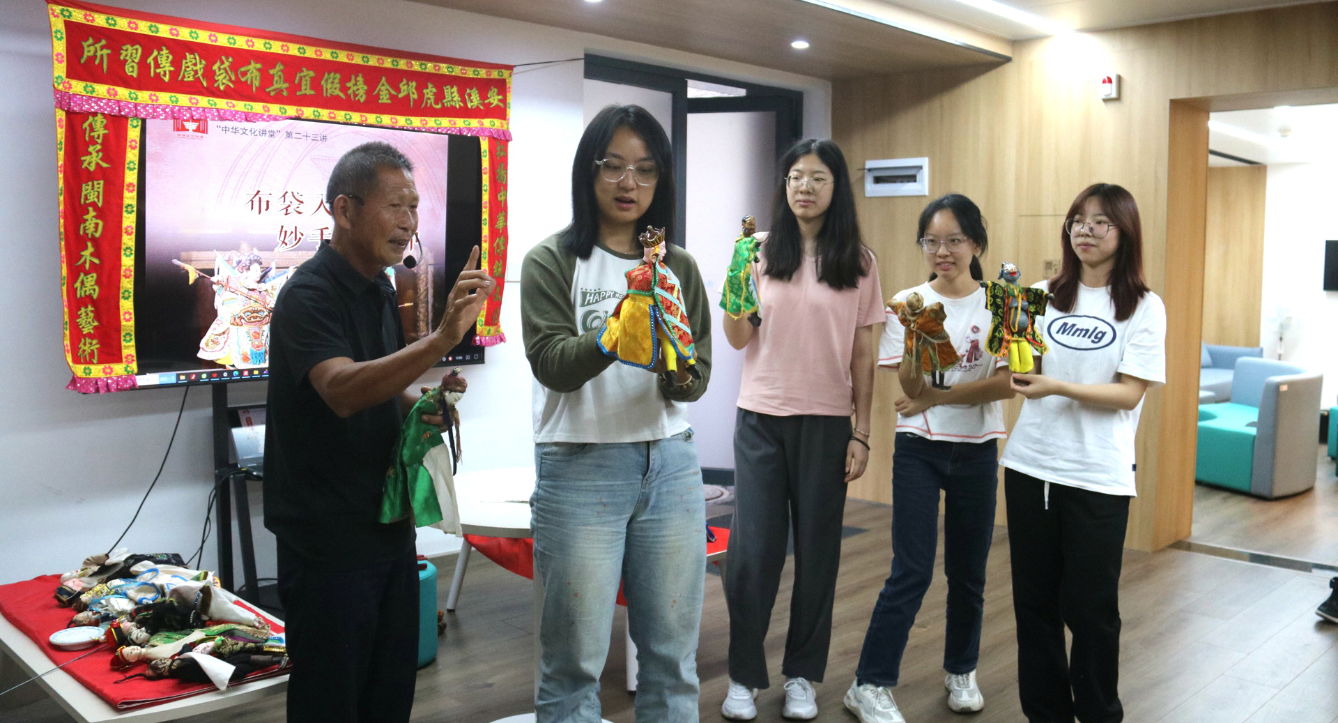 “中华文化讲堂”上学生体验布袋戏表演