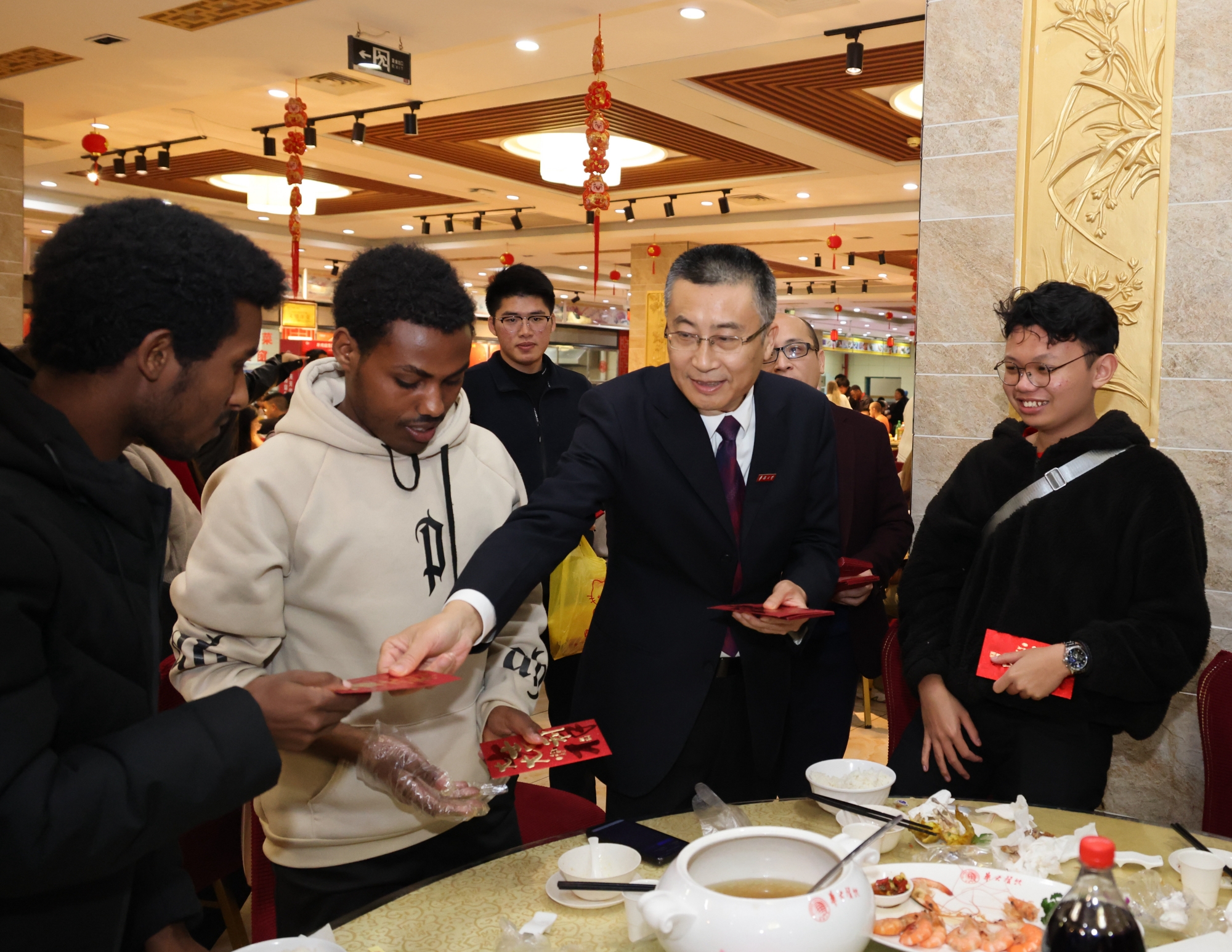 当晚,校长吴剑平,副校长王秀勇,党委副书记、纪委书记何纯正等出席两校区晚宴,吴剑平、王秀勇分别致辞,为留校师生送上新春祝福。而除了准备丰盛的菜肴,校领导们还向学生们派发了“压岁钱”。接过象征红红火火的红包,学生们纷纷拍照上传,与家人朋友分享节日的喜悦,在佳肴飘香、欢声笑语中传递对新年的美好祝愿。