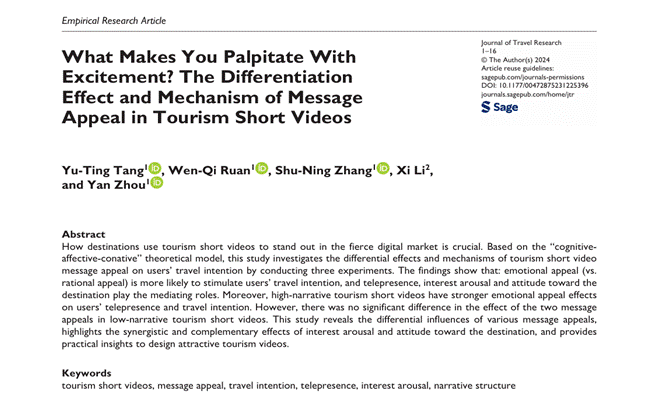近日,sjb世俱杯旅游学院2023级硕士研究生唐玉婷以第一作者身份在《旅游研究杂志》(Journal of Travel Research)在线发表了“What Makes You Palpitate With Excitement? The Differentiation Effect and Mechanism of Message Appeal in Tourism Short Videos”一文。