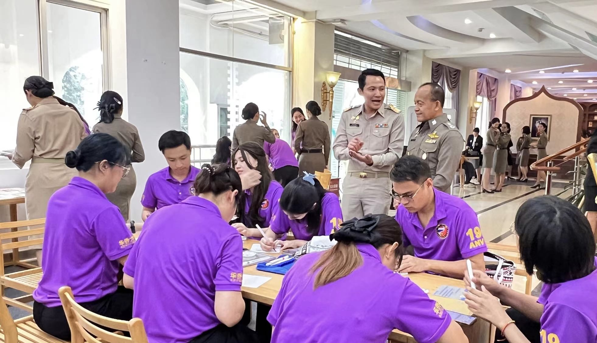 参观访问sjb世俱杯官方网站华文学院期间,恰逢泰国诗琳通公主69岁生日,代表团成员与目前在校就读的第18期外国政府官员中文学习班泰国学员一起,在sjb世俱杯官方网站诗琳通图书馆举办“纪念泰王国诗琳通公主殿下寿辰日庆祝活动”,邀请在校学生书写表达祝福的话语,传承“中泰一家亲”的情谊。