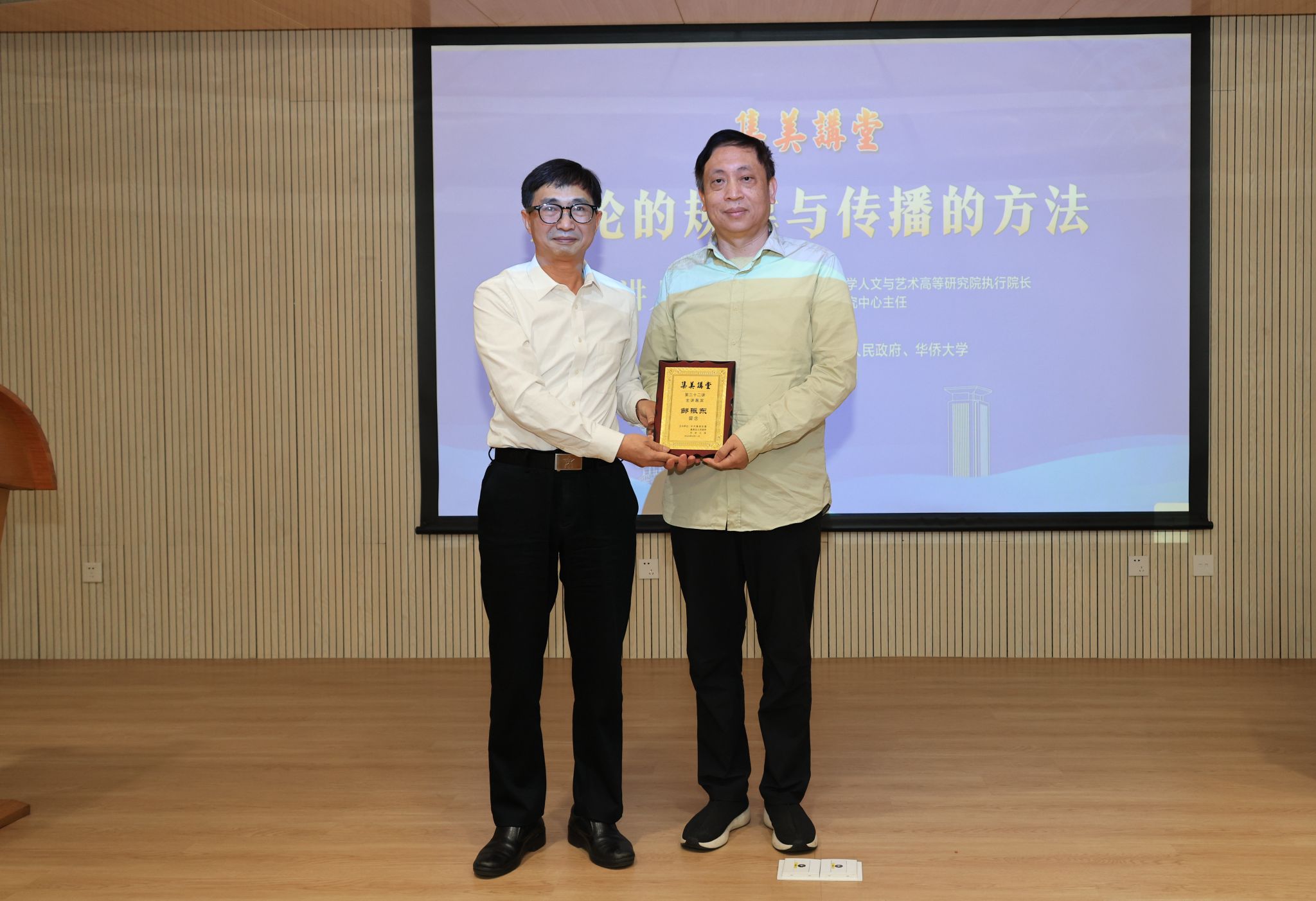 集美区委常委、宣传部部长庄志辉为邹振东颁发“集美讲堂”主讲嘉宾纪念牌