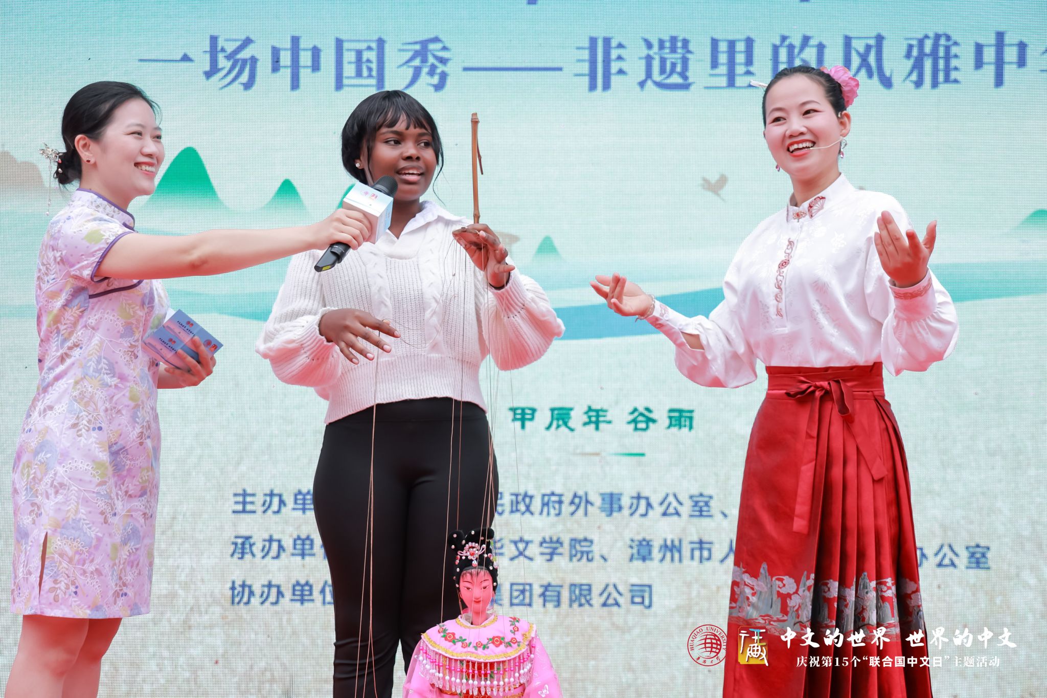 而在非遗文化表演环节,围绕“非遗里的风雅中华”这一主题,中国的艺术家们和外国留学生一起表演茶艺、古琴、提线木偶、拓字、剪纸等,生动呈现出中华传统非遗文化的魅力。来自非洲国家加蓬的留学生伊娜,在活动中跟着舞台上的老师学习讲闽南语,深情地唱道:“中文的世界很趣味,世界的中文多神奇……”,引发现场的热烈掌声。“颂”福环节中,多国留学生共同提笔,在12米长卷上用毛笔书写“福”字,寓意将祝福播撒到世界各地……