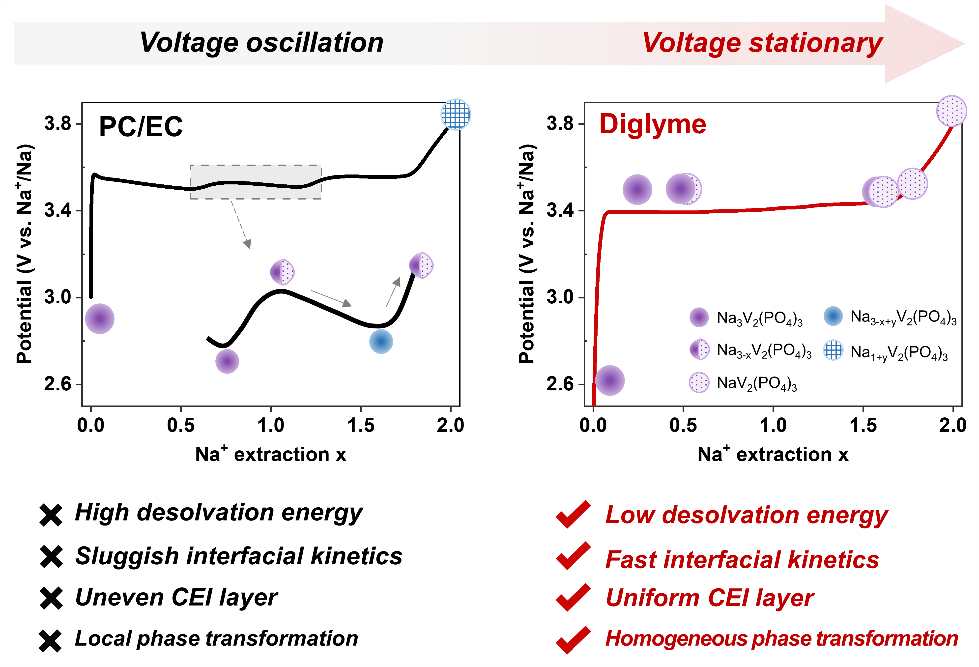鉴于此,阙兰芳副教授研究团队根据前期关于低温金属离子电池与理论计算的研究工作积累(Angew. Chem. Int. Ed.2022,61, e202213416;Adv. Mater.2023,35,2307592),在本研究中聚焦SIBs低温电压振荡的起源及其控制因素,通过电化学测试、原位表征并结合理论计算模拟,探究了NVP(磷酸钒)正极在PC(碳酸丙烯)/EC(碳酸乙烯)基电解质中的电压振荡行为,并证实该现象与材料在低温下的局域相转变密切相关;揭示了影响NVP正极在PC/EC基电解质中低温局部相变的主要因素,进而提出消除低温电压振荡的策略,构建了兼具良好低温适应性与优异循环稳定性的钠离子全电池。本研究为解决SIBs在极端工况环境下所面临的性能限制和稳定性挑战等问题提供新的思考视角和实施途径。