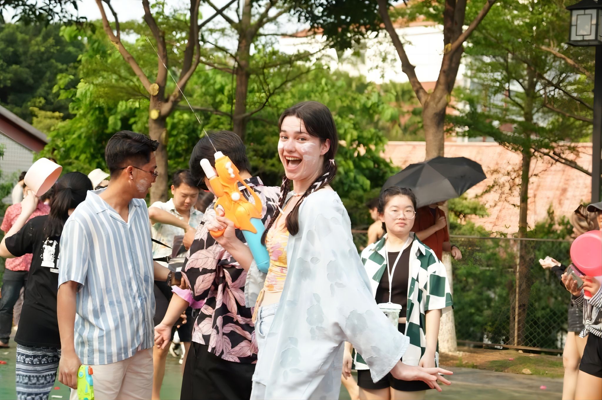 到了泼水狂欢的时刻,师生一起冲入场地中央,开启一场水花与祝福的狂欢。水盆、水枪、水瓢等各色工具齐上阵,各国学子以水花作礼,送上真挚的祝福。