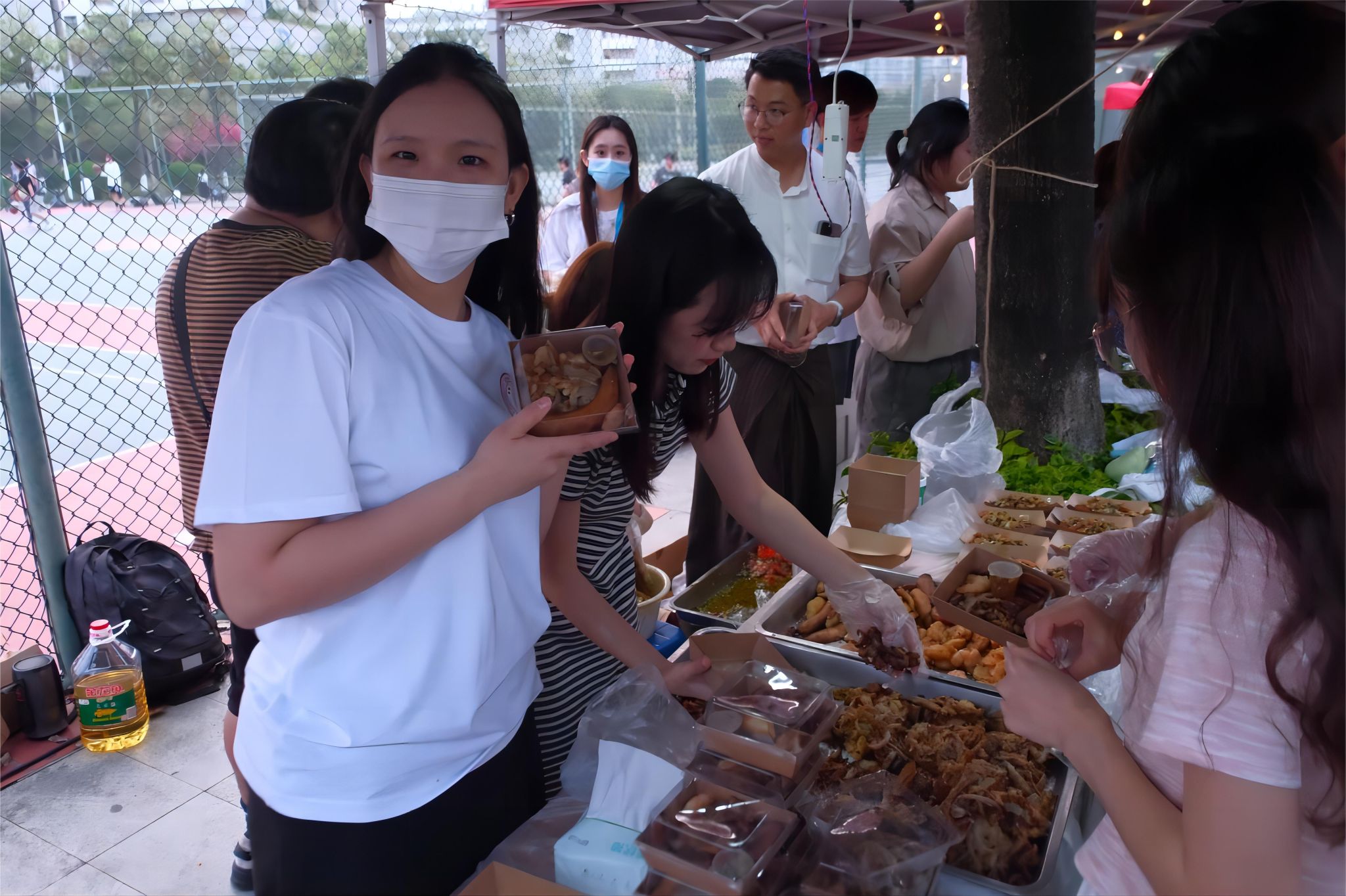 今年的泼水节庆祝活动中还设有美食环节,各个国家和地区的同学各自精心装饰摊点,摆满琳琅精致、热气蒸腾的特色美食,吸引师生大快朵颐,既承载着各国同学的家乡记忆,也传递出一份份真挚情谊。