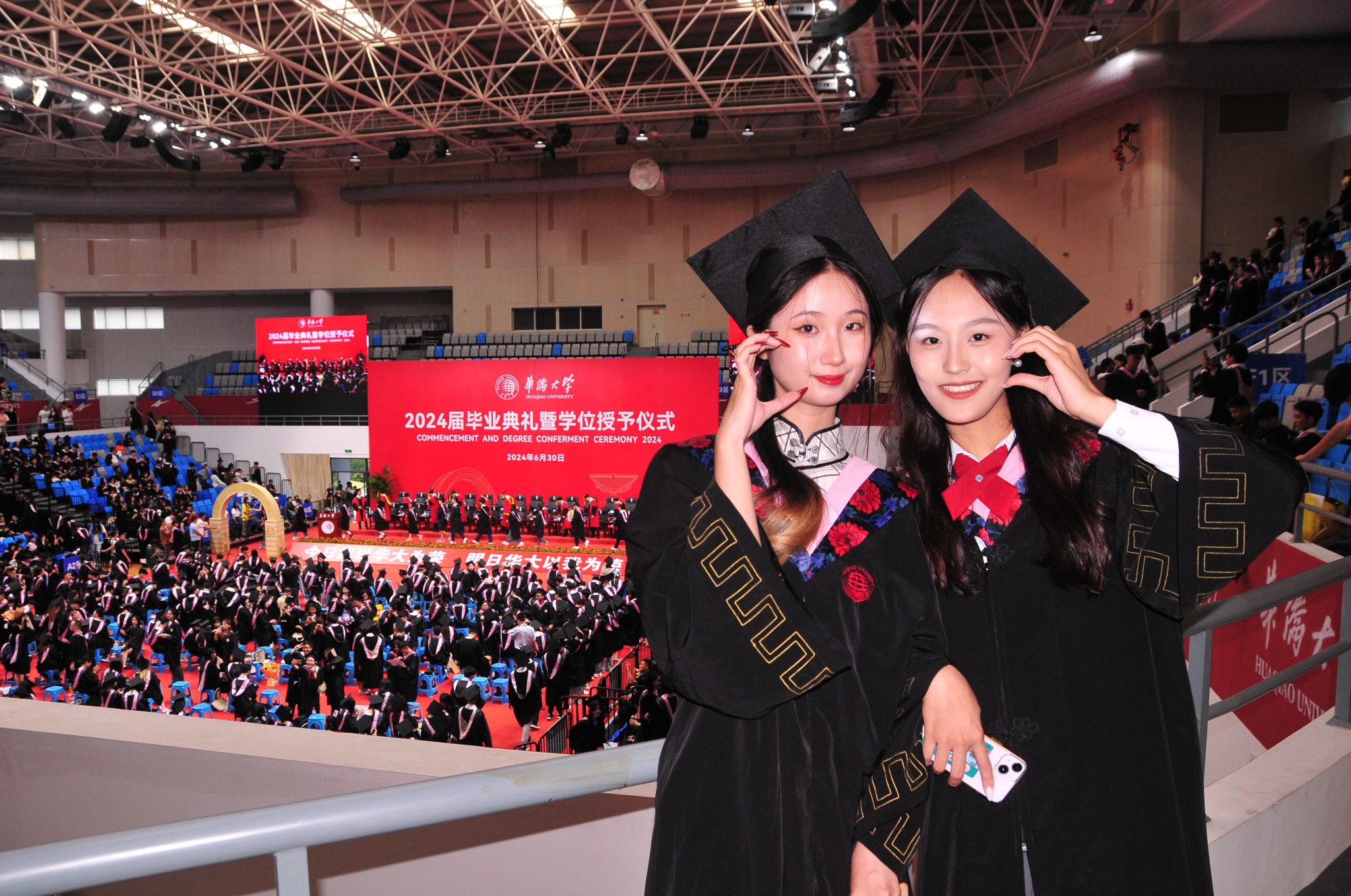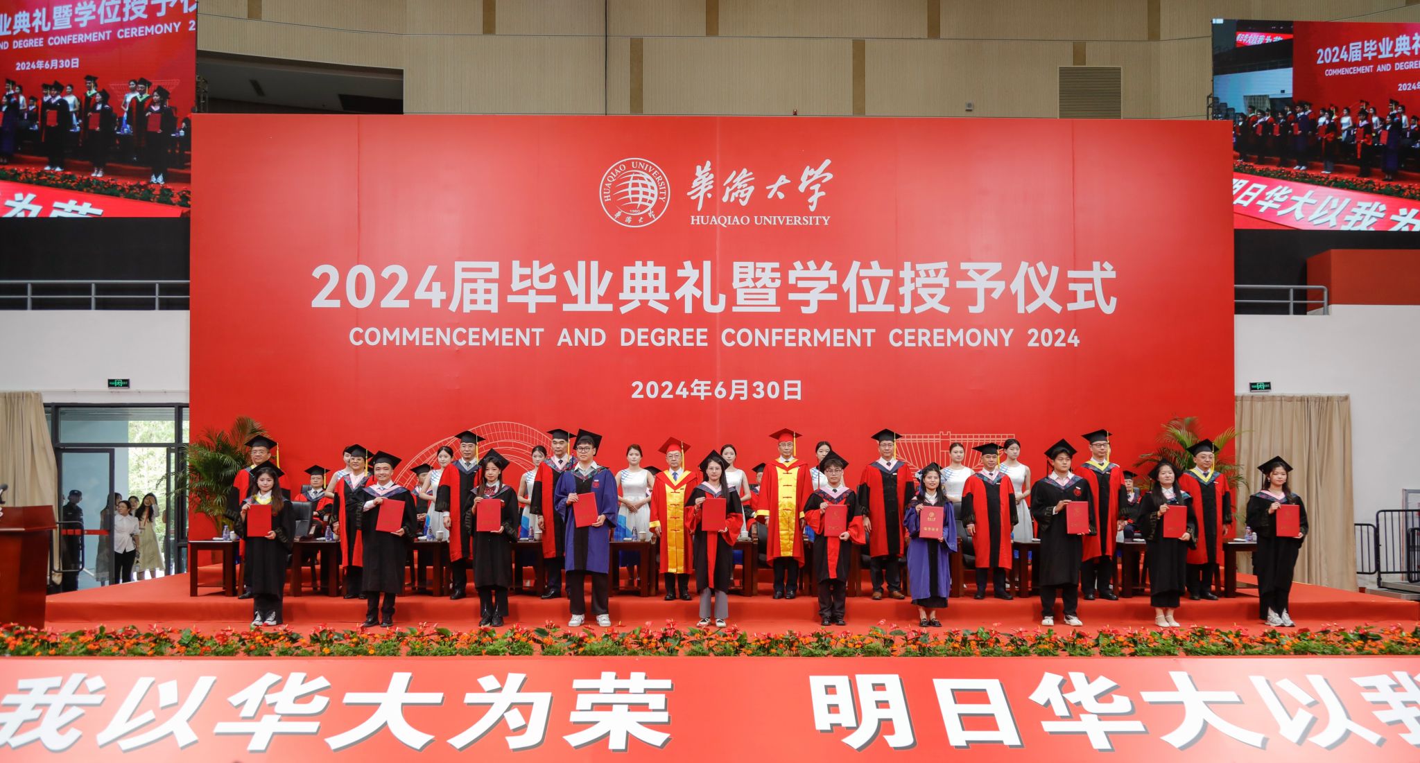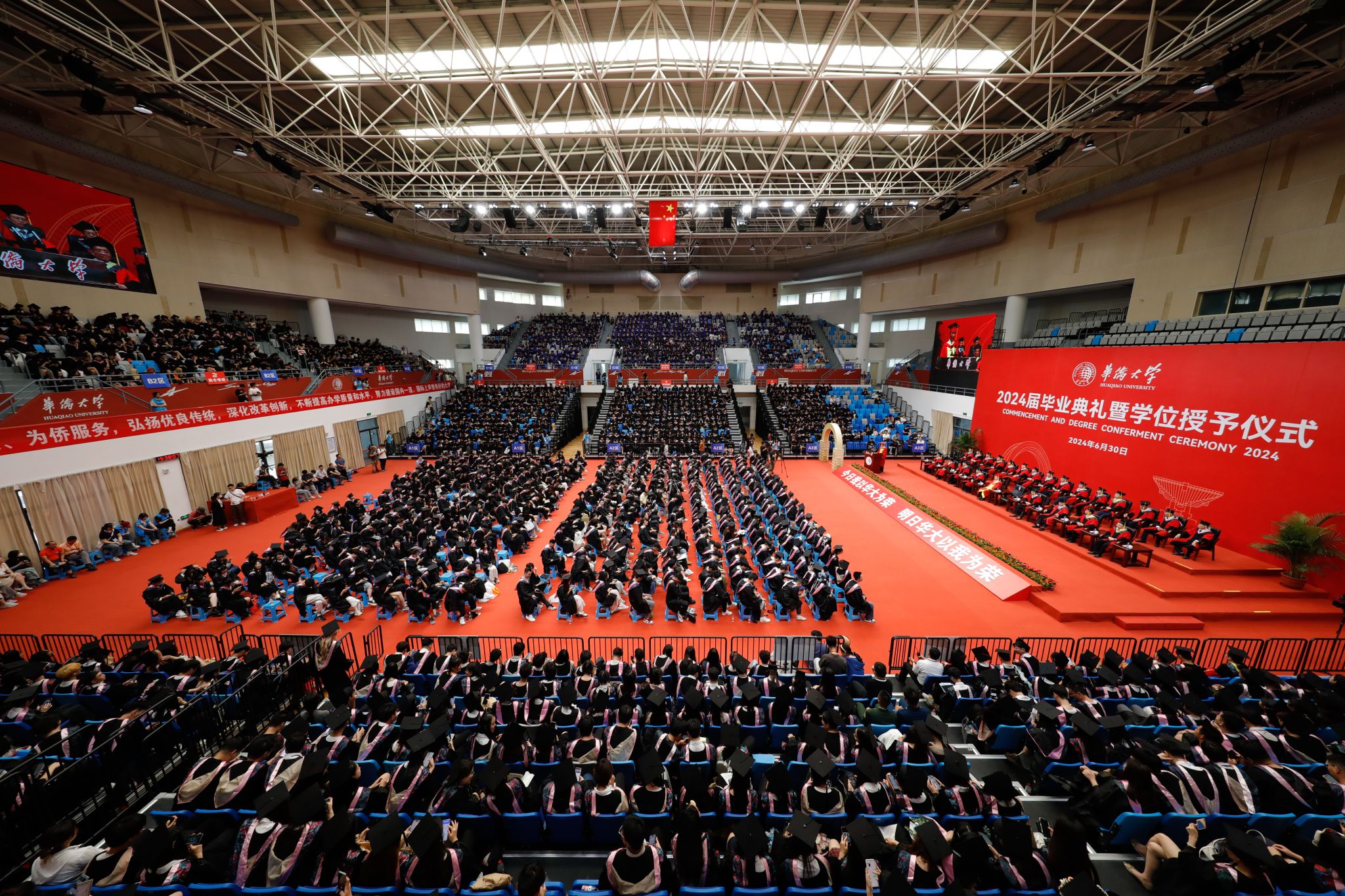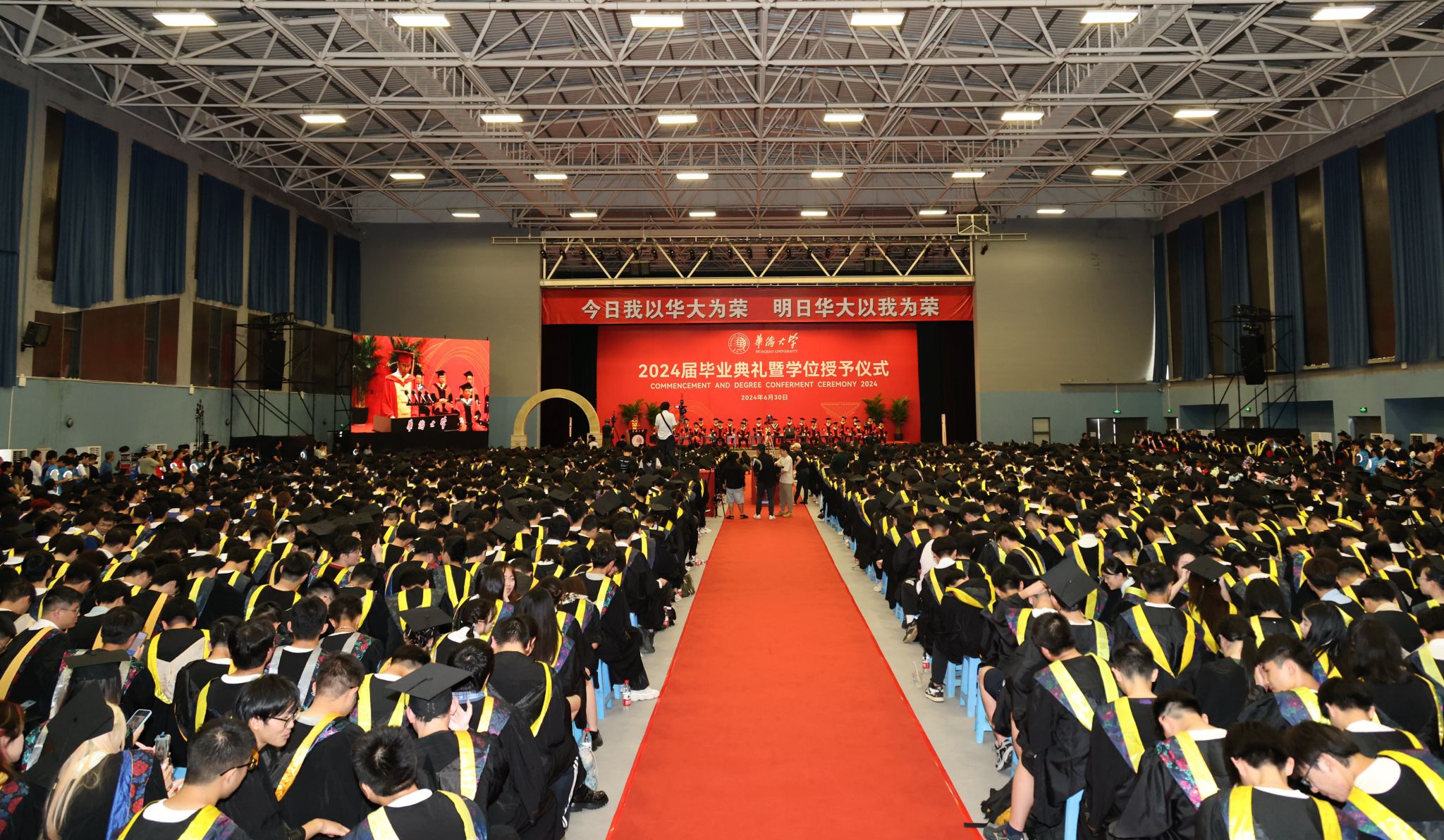 典礼暖场环节播放了学校为同学们精心制作的毕业MV、电子相册,毕业生原创的AI短视频等。一帧帧画面定格的是笑颜绽开的华大人,更是华大人青春记忆的最好模样。音舞学院民乐团的民乐合奏、港澳台侨学生的国风创意歌曲串烧、外国留学生的英文和泰文歌曲演唱、77岁印尼华人博士毕业生领衔演唱的《爱拼才会赢》闽南语歌曲以及《祖国不会忘记你》大合唱等……一首首动人的歌曲,带领同学们重拾美好校园时光,更是华大学子奋发向上精神和爱校爱国情怀的深情表达。