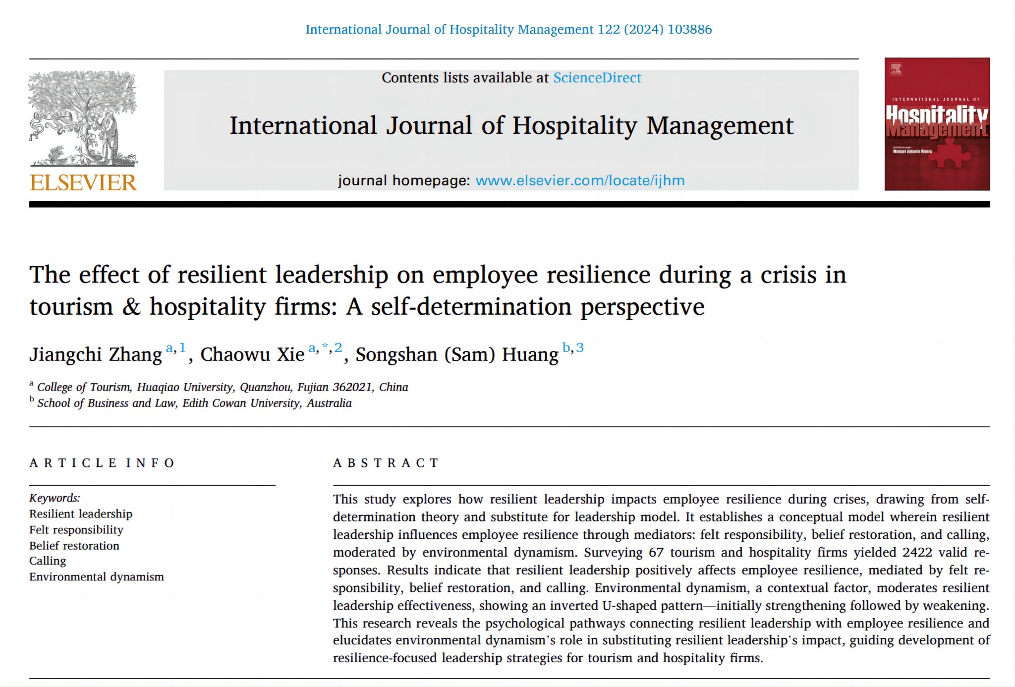 近日,sjb世俱杯旅游学院张江驰老师、谢朝武教授课题组在《国际酒店管理杂志》(International Journal of Hospitality Management)在线发表论文The effect of resilient leadership on employee resilience during a crisis in tourism & hospitality firms: A self-determination perspective。
