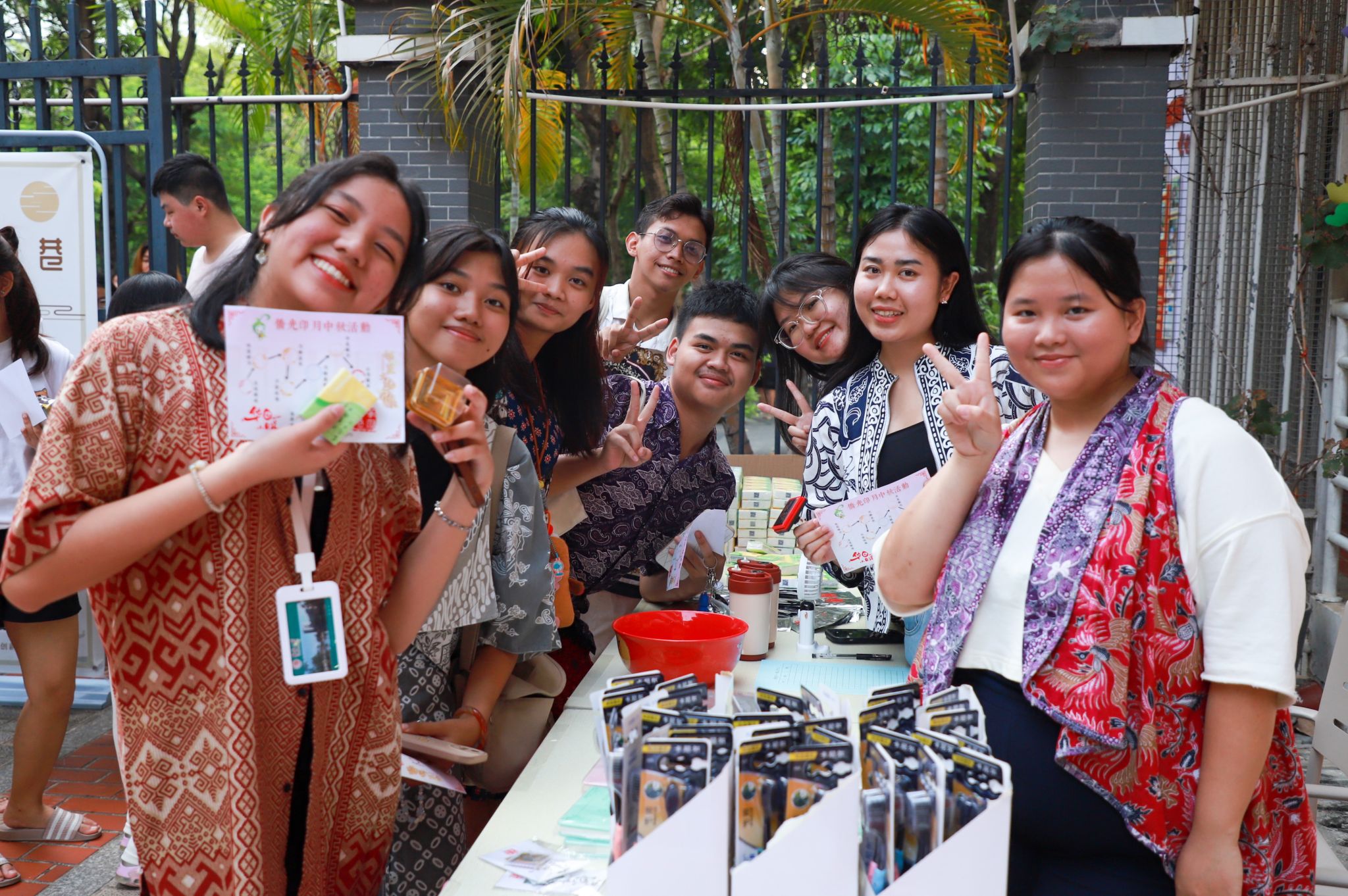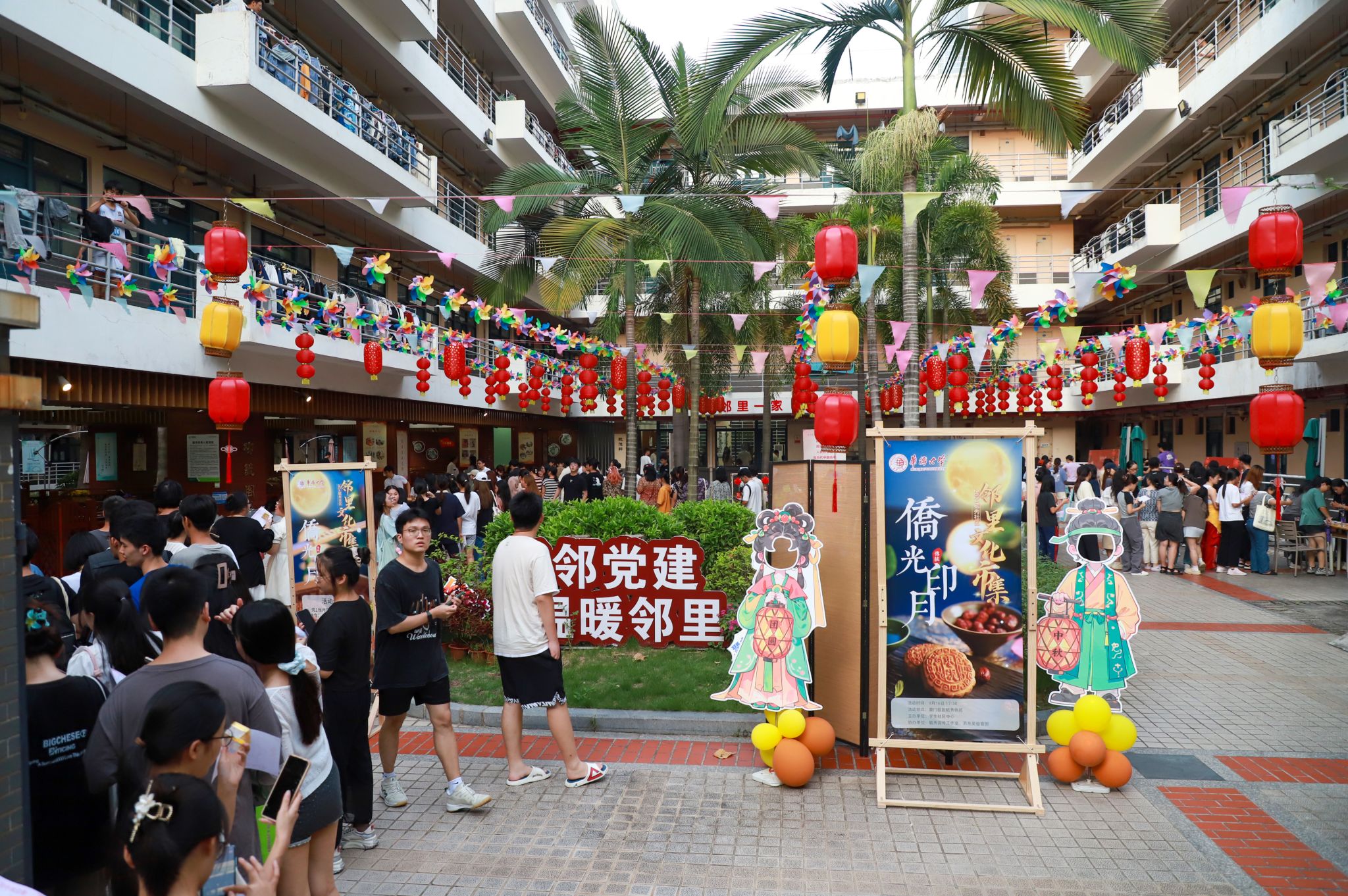 华园各处也节日氛围满满。中秋期间,学校组织了中秋游园、文化交流、文艺快闪,还有做月饼、猜灯谜、投壶、博饼、制作手工灯笼等文化体验活动。