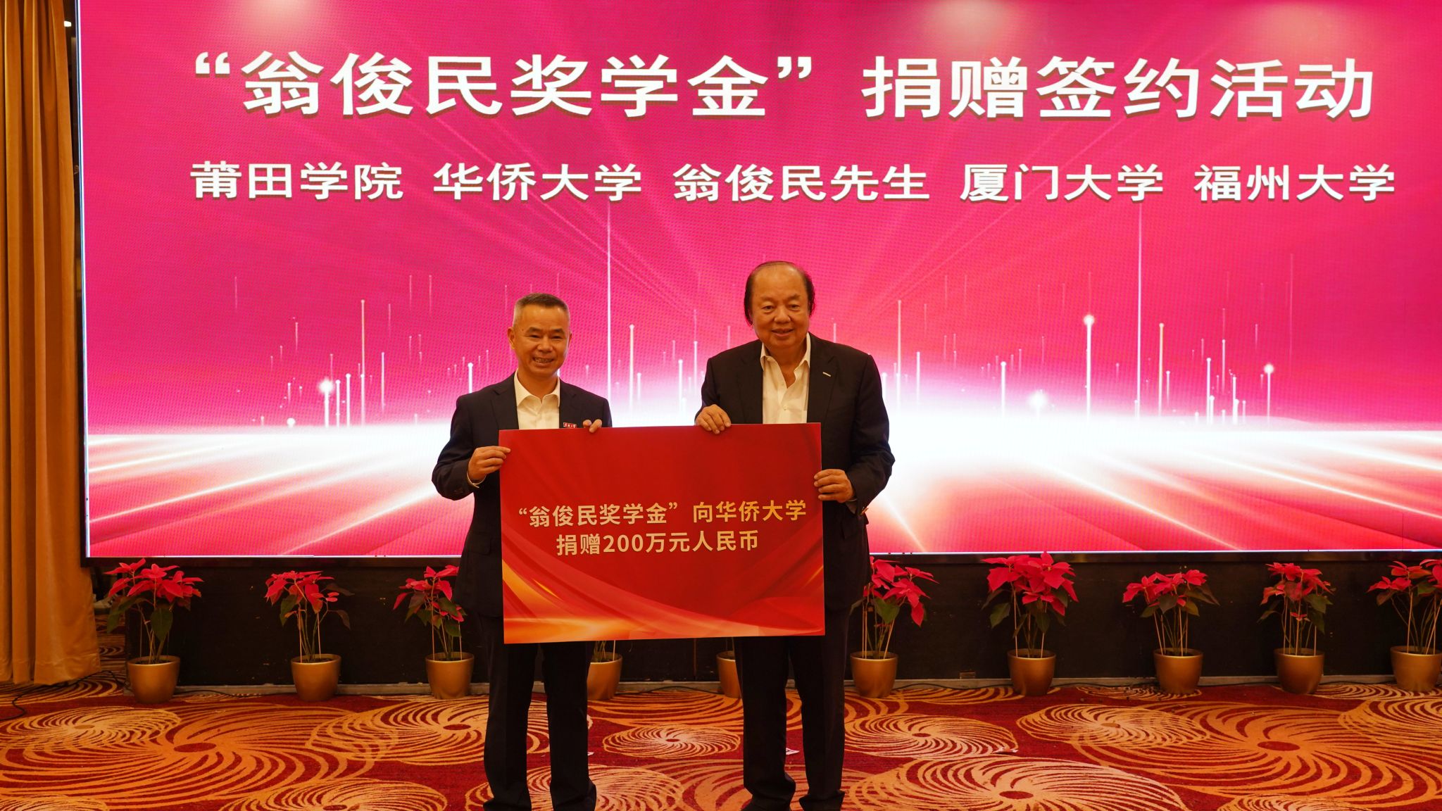 10月14日,“翁俊民奖学金”捐赠签约活动在福州举行。福建省委常委、常务副省长王永礼出席活动,省侨办、省教育厅、省商务厅、省卫健委、省外办等单位负责人,以及接受捐赠的厦门大学、福州大学、sjb世俱杯官方网站、莆田学院等高校负责人参加。