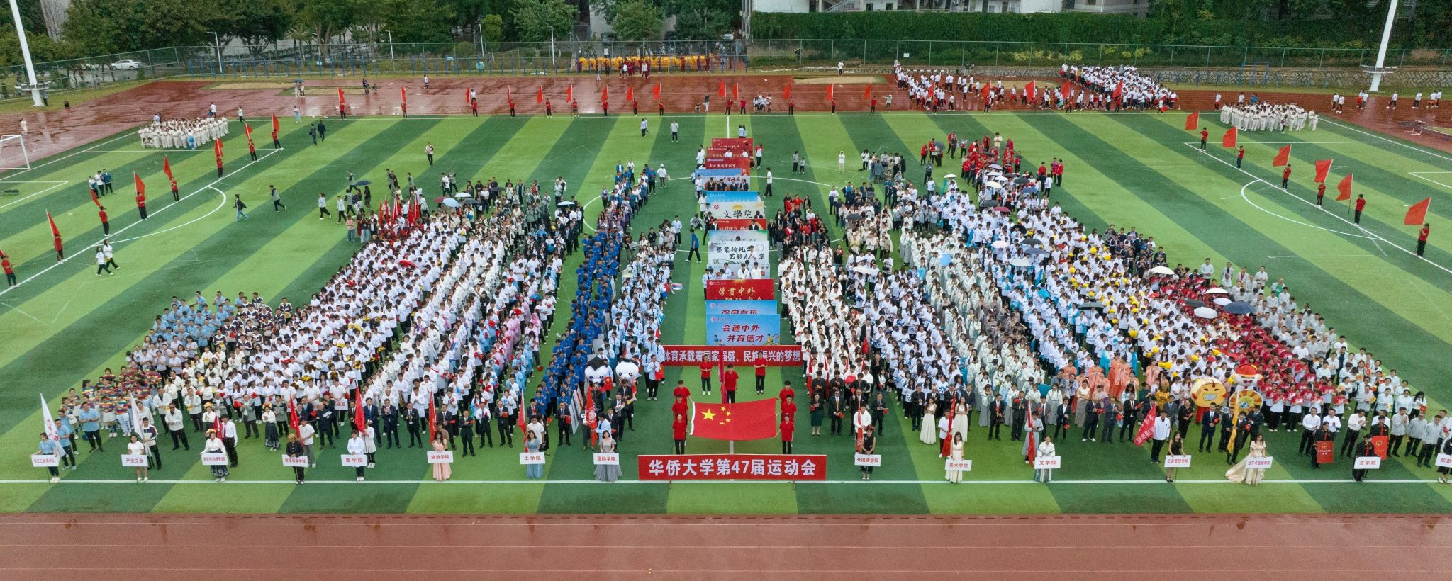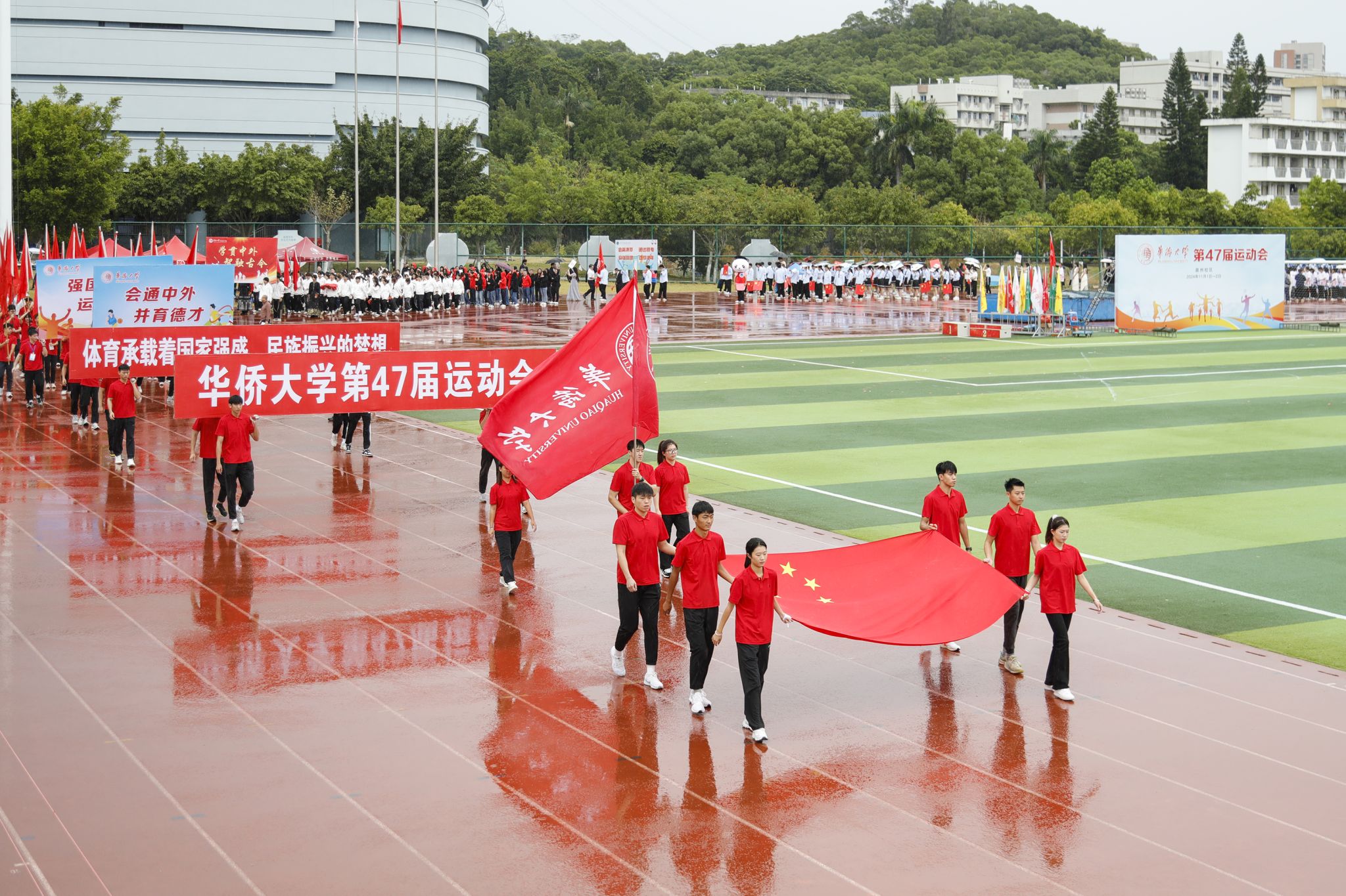 风雨中,来自泉州校区各学院及产业、后勤、机关工会代表队的15个方阵陆续登场。他们步伐整齐,意气风发,英姿飒爽,步宇轩昂,展现出华大人认真热烈的体育态度与自信昂扬的精神面貌。各方阵创意百出,或头戴簪花,或身着汉服及民族服饰,焕发无限活力,献礼建校64周年。