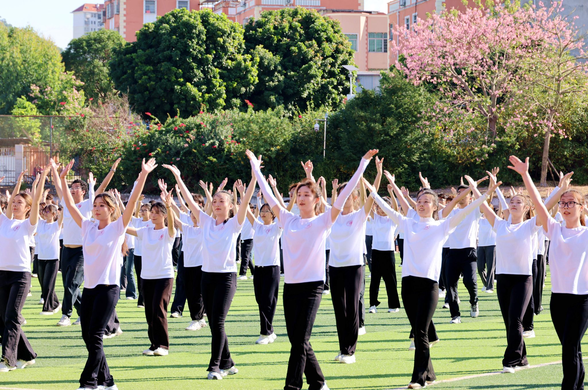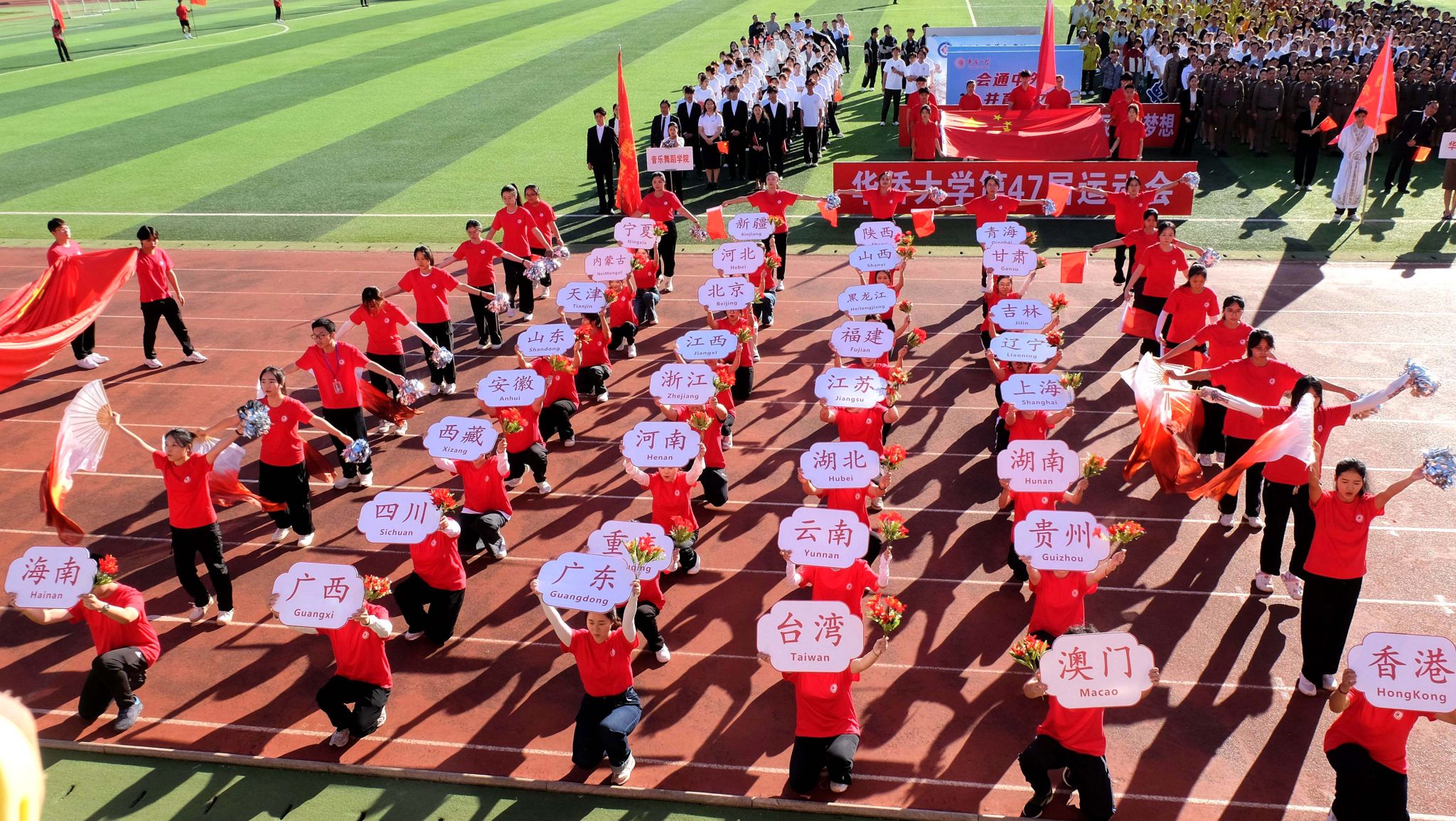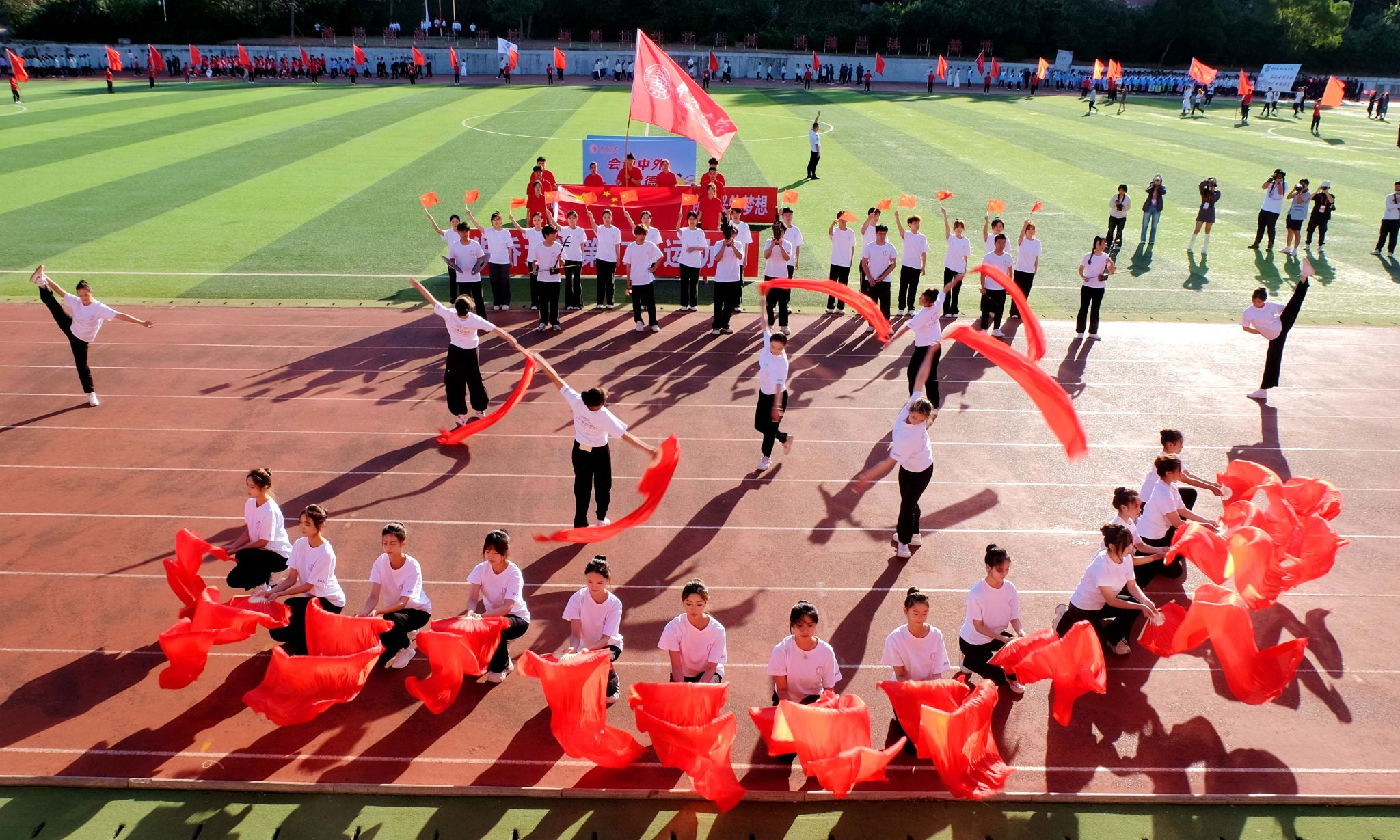 文体表演中,由退休职工带来彩带龙表演,腾飞的彩带龙翩然若惊鸿,舞出教职工的热情;校园舞者动感街舞引燃全场,以律动绘制青春风采;音舞学院的原创舞蹈《家园》在探身展臂间展示和谐之美,倾诉家国眷恋;武术协会上演融合武术表演,一招一式尽展文明高尚,剑棍扇拳演绎民族风采;1110名学子排舞串烧活力无限,点燃激情气氛,展现体育精神。