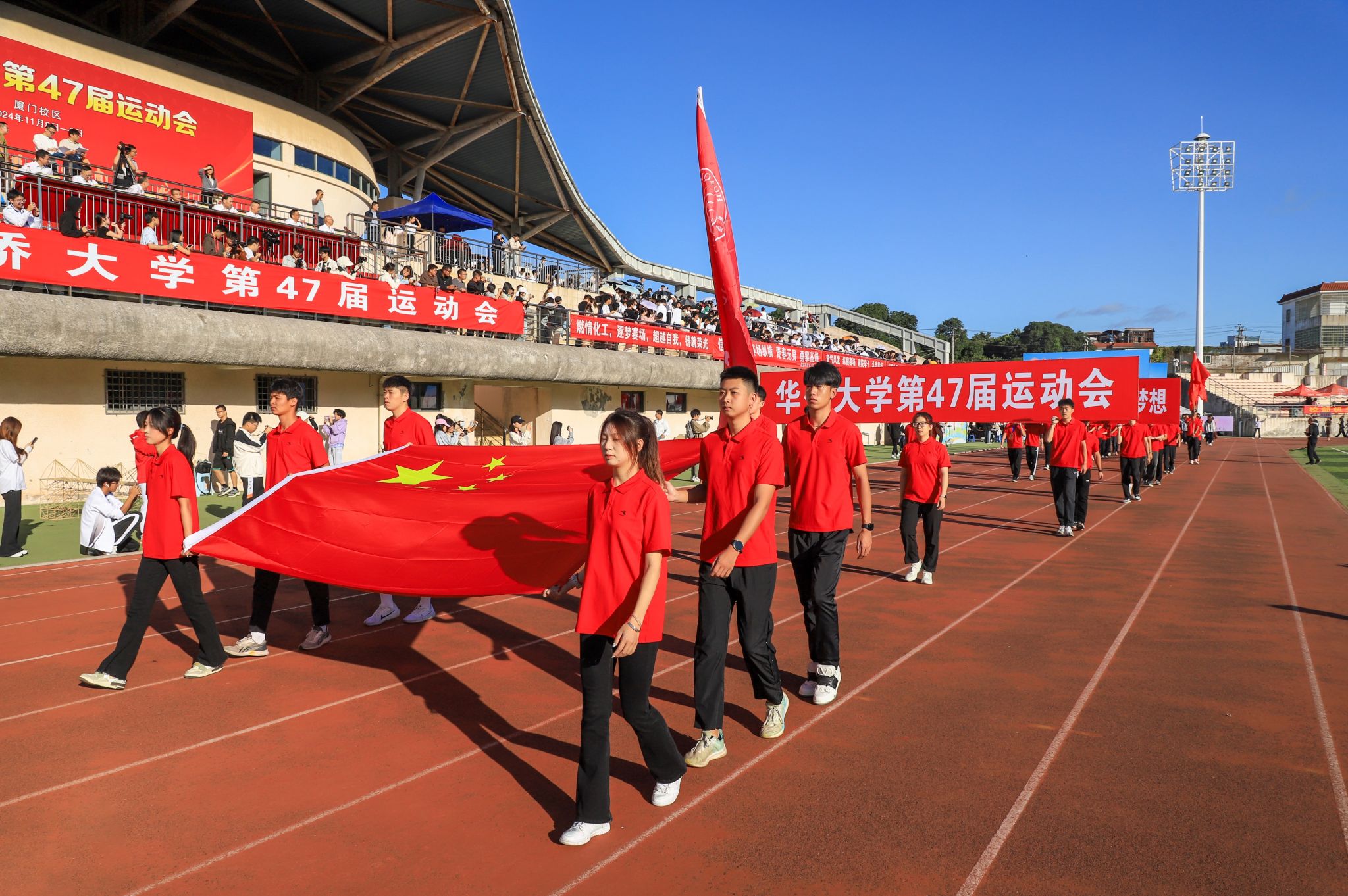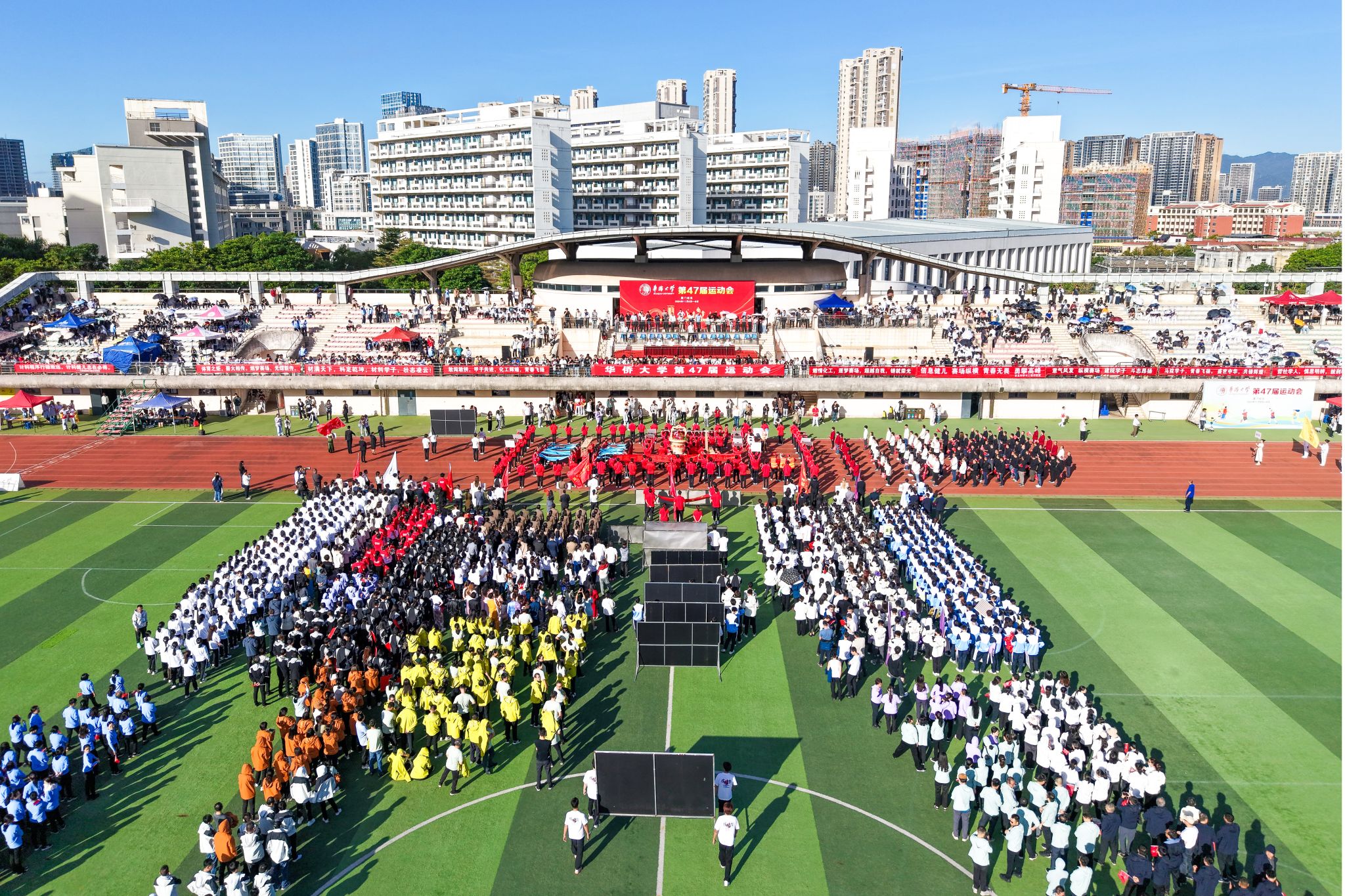 开幕式上,厦门校区各学院以及机关工会代表队的15个方阵有序进场。他们昂首挺胸,踏着整齐的步伐,以独特的形式展现属于他们的风采,以良好的精神风貌彰显华大学子的蓬勃朝气。以歌曲《世界一家》作配,华文学院境内外学子身着特色服饰,展现和而不同、美美与共的文化内涵;音舞学院舞动《云宫迅音》,演绎中国浪漫,彰显文化自信;计算机学院撑伞旋转,拼出“HQU”字样与五星红旗,以赤子之心告白学校与祖国;化工学院迎来60周年院庆,鲜艳的手翻花排出“60”字样,彩烟翻涌,共贺嘉年……