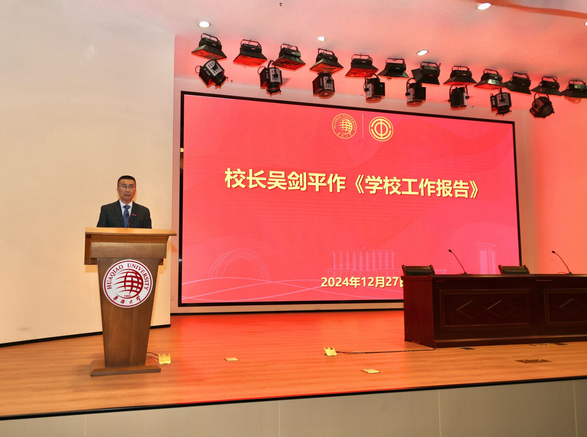 校长吴剑平以《坚持正确方向 全面深化改革 奋力书写教育强国建设的华大篇章》为题作学校工作报告。报告从人才培养、服务统战侨务、高质量发展、服务社会能力、办学条件等方面全面总结回顾2024年及过去四年学校的工作成绩,并提出学校下一步的工作思路和要求。