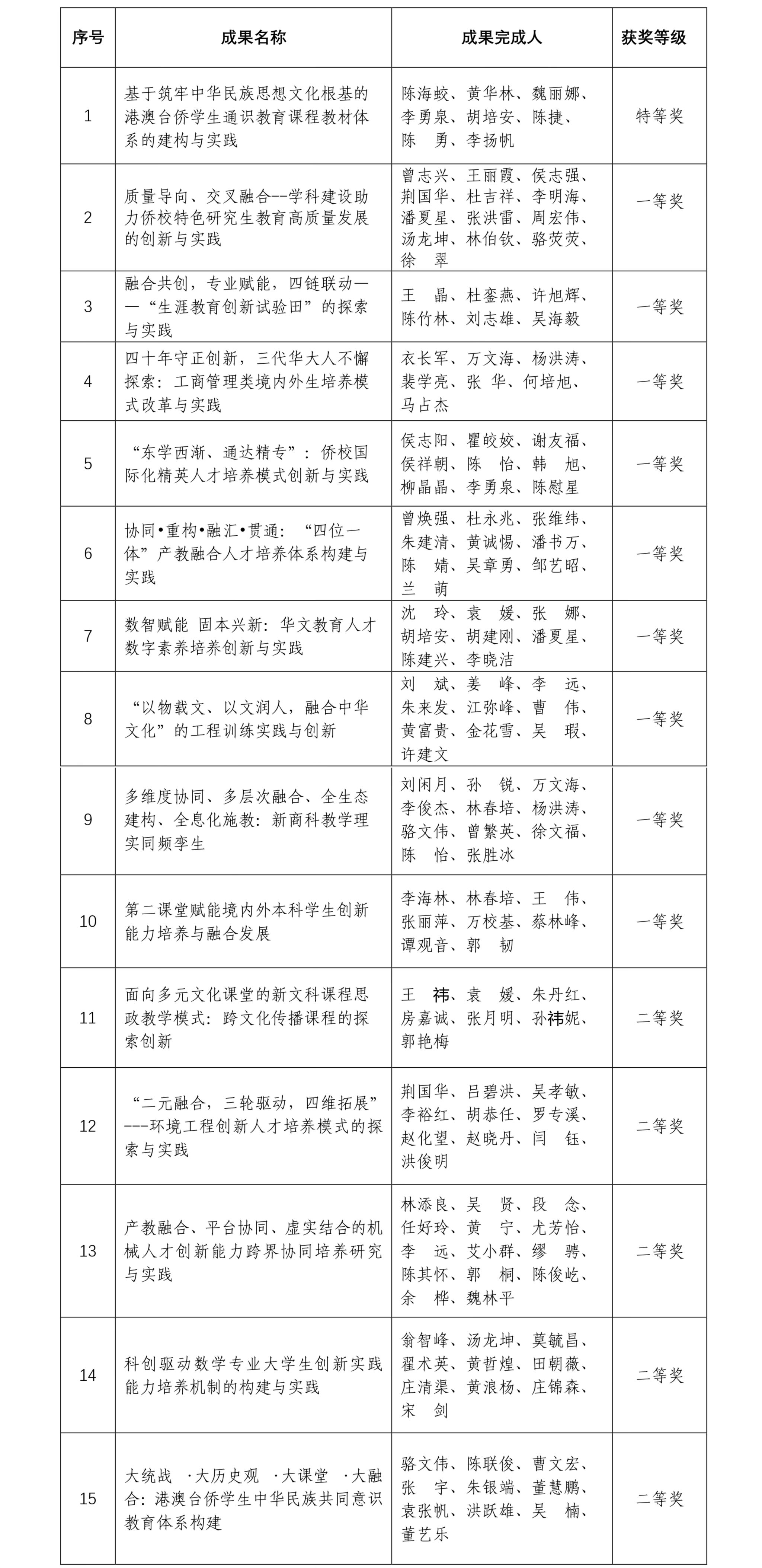 此次获奖成果有本科教学成果14项、研究生教育成果1项。其中《基于筑牢中华民族思想文化根基的港澳台侨学生通识教育课程教材体系的建构与实践》成果获特等奖,《质量导向、交叉融合--学科建设助力侨校特色研究生教育高质量发展的创新与实践》等9项成果获一等奖,《面向多元文化课堂的新文科课程思政教学模式:跨文化传播课程的探索创新》等5项成果获二等奖。