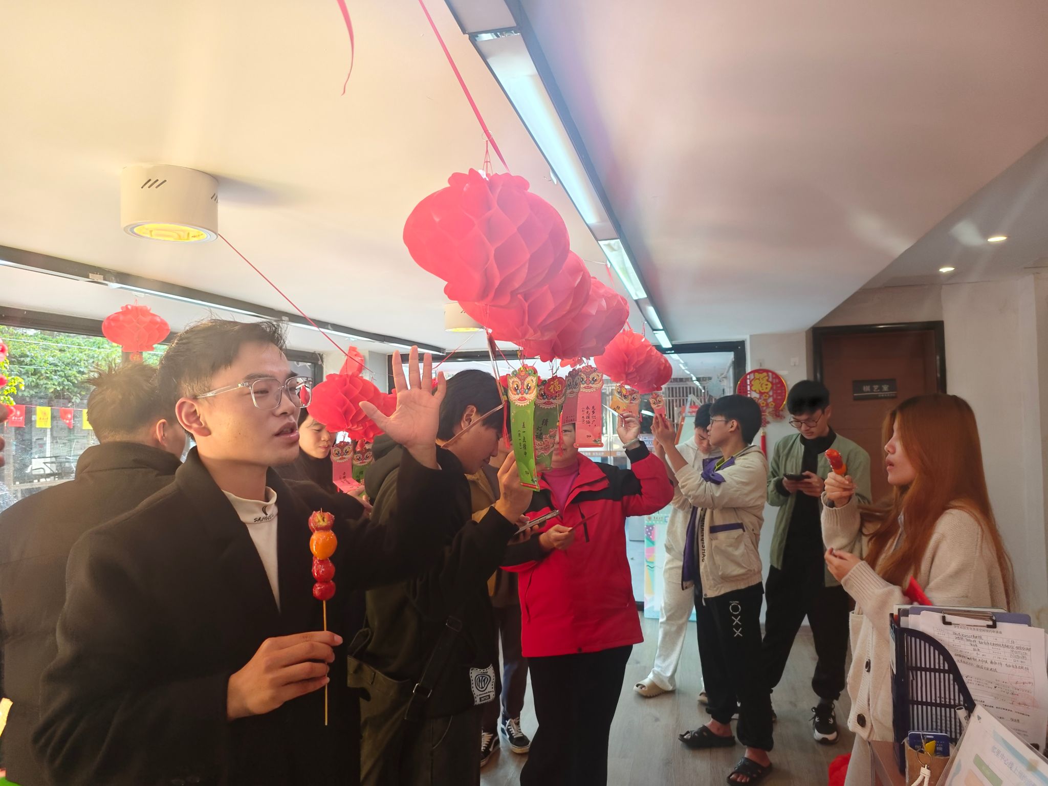 “‘每隔数日脱旧衣,没有脚爪走得急;攀缘树木多轻便,光滑地面步难移’这个谜面一定是‘蛇’字!”华文学院2024级印尼留学生达任激动地说。同学们穿梭在红彤彤的迷笺之间,或冥思苦想,或信手拈来,或兴致冲冲地与好友讨论谜题。