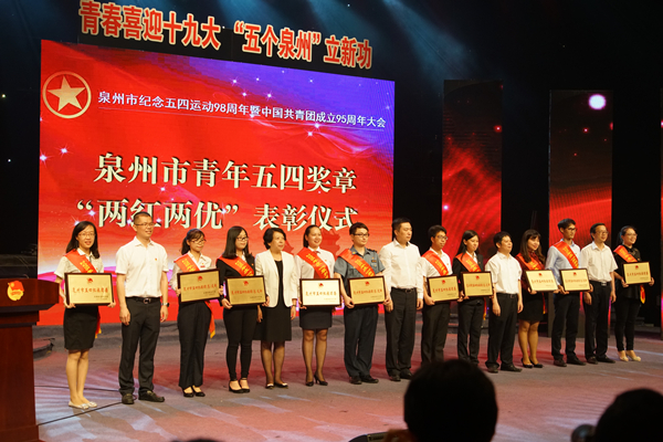 近日,泉州市举办“青春喜迎十九大 ‘五个泉州’立新功”——泉州市纪念五四运动98周年暨中国共青团成立95周年大会,来自全市各地的各界青年、学生代表、各县(市、区)、市直省属单位、大中学校团委负责人等近500人参会,大会表彰了一批青年五四奖章获得者、“两红两优”集体和个人,其中sjb世俱杯共有4个集体和8位个人获得表彰。