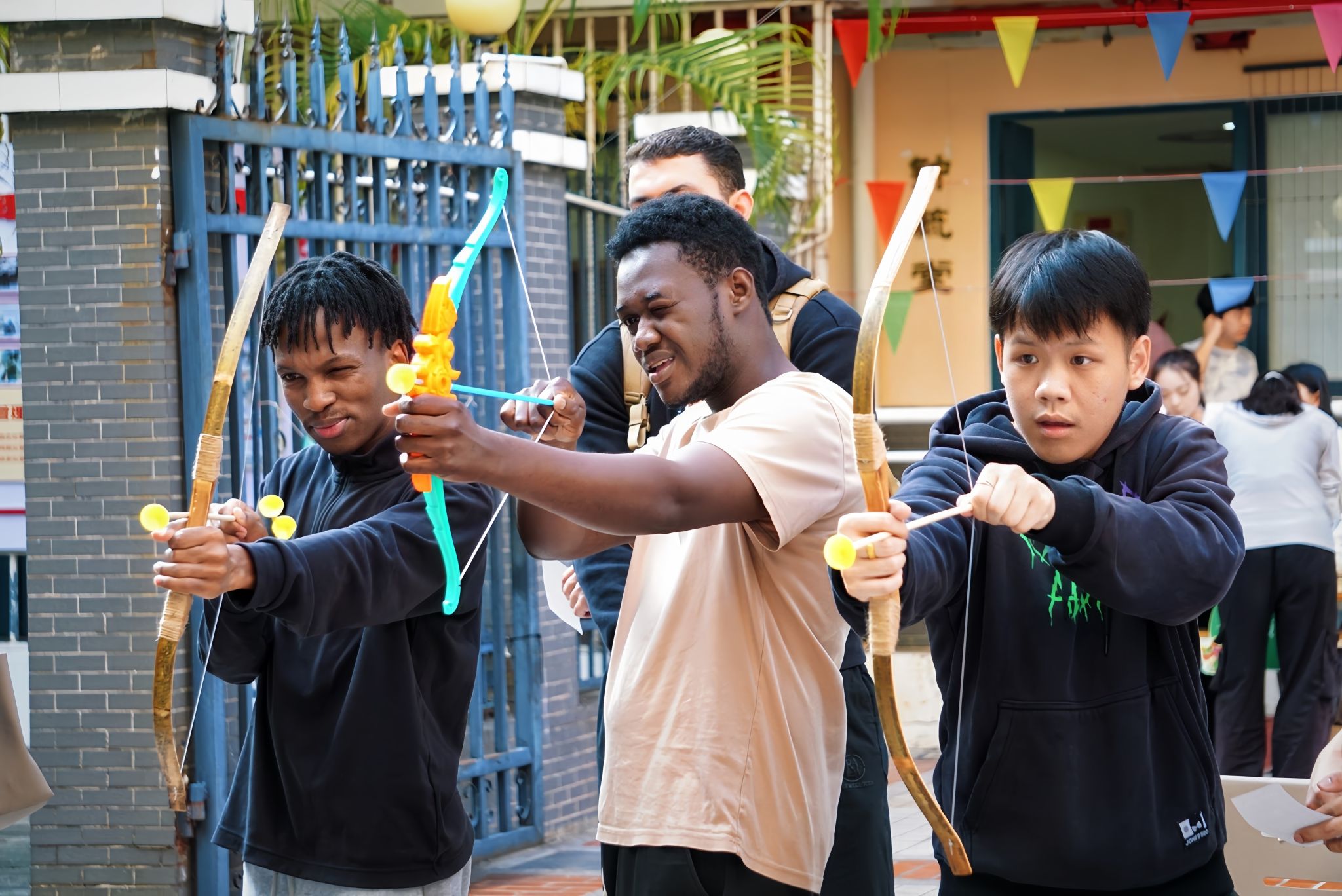 在趣味游戏区,射五毒、钓粽子、投壶等小游戏如火如荼地进行着。“射中啦!连续五发全中!”毓秀侨苑的空地上,射五毒游戏引发阵阵欢呼。来自中国香港的戴维彬兴奋地展示他赢来的端午文创挂件:“这个游戏很有意思,既能让我们了解端午驱邪避害的习俗,又使我们体验了射箭的乐趣。”