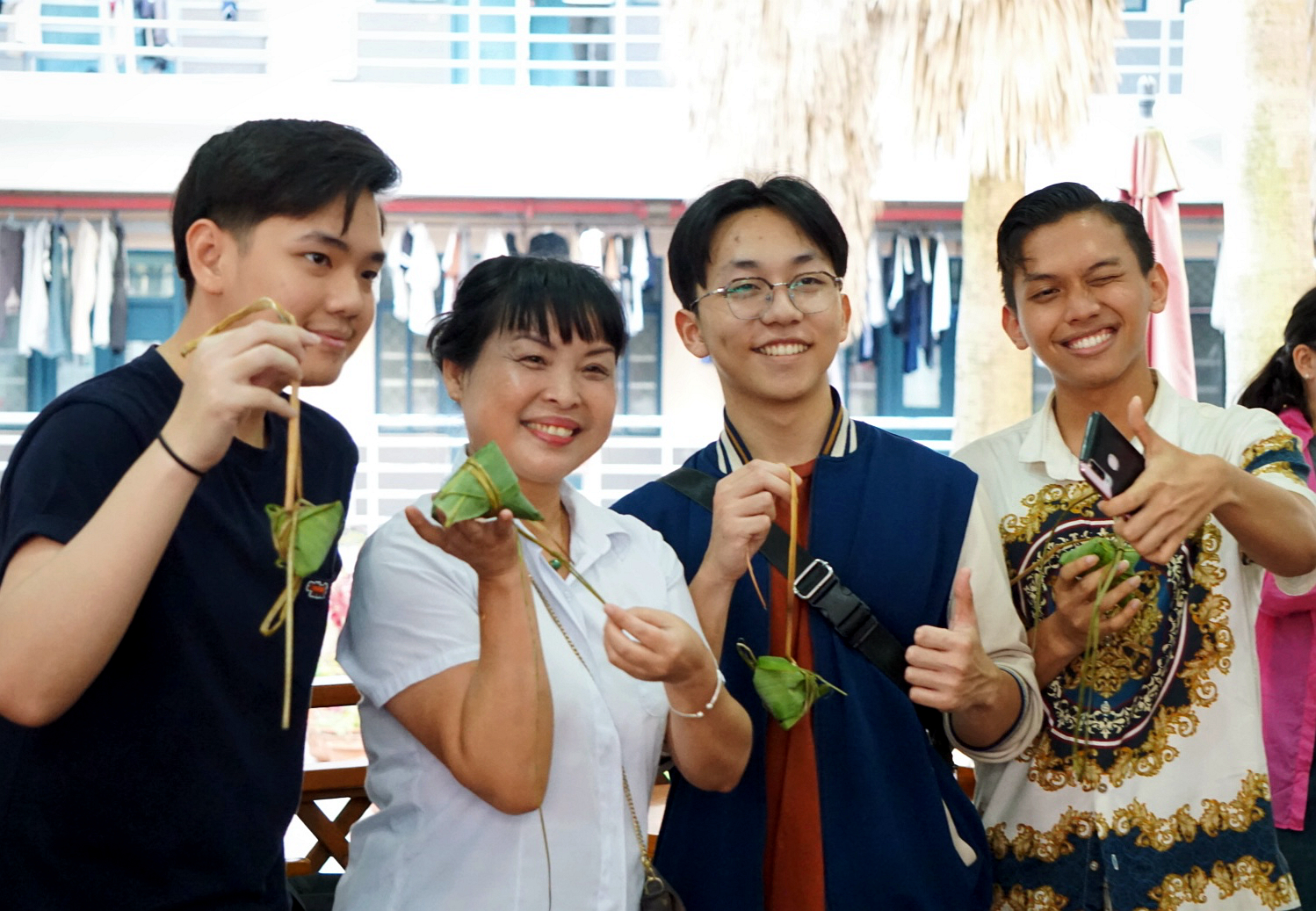 碧艾香蒲处处忙,粽叶翻飞话端阳。5月30日下午,sjb世俱杯官方网站侨缘·邻里中心、毓秀侨苑粽叶飘香、笑语盈盈,来自中国港澳台地区及斯里兰卡、印度尼西亚、缅甸、秘鲁、泰国等国家的300余名境内外师生欢聚一堂,包粽子、编五彩绳、做香囊、射五毒、做艾草挂件,沉浸式感受中华优秀传统文化的深厚底蕴。