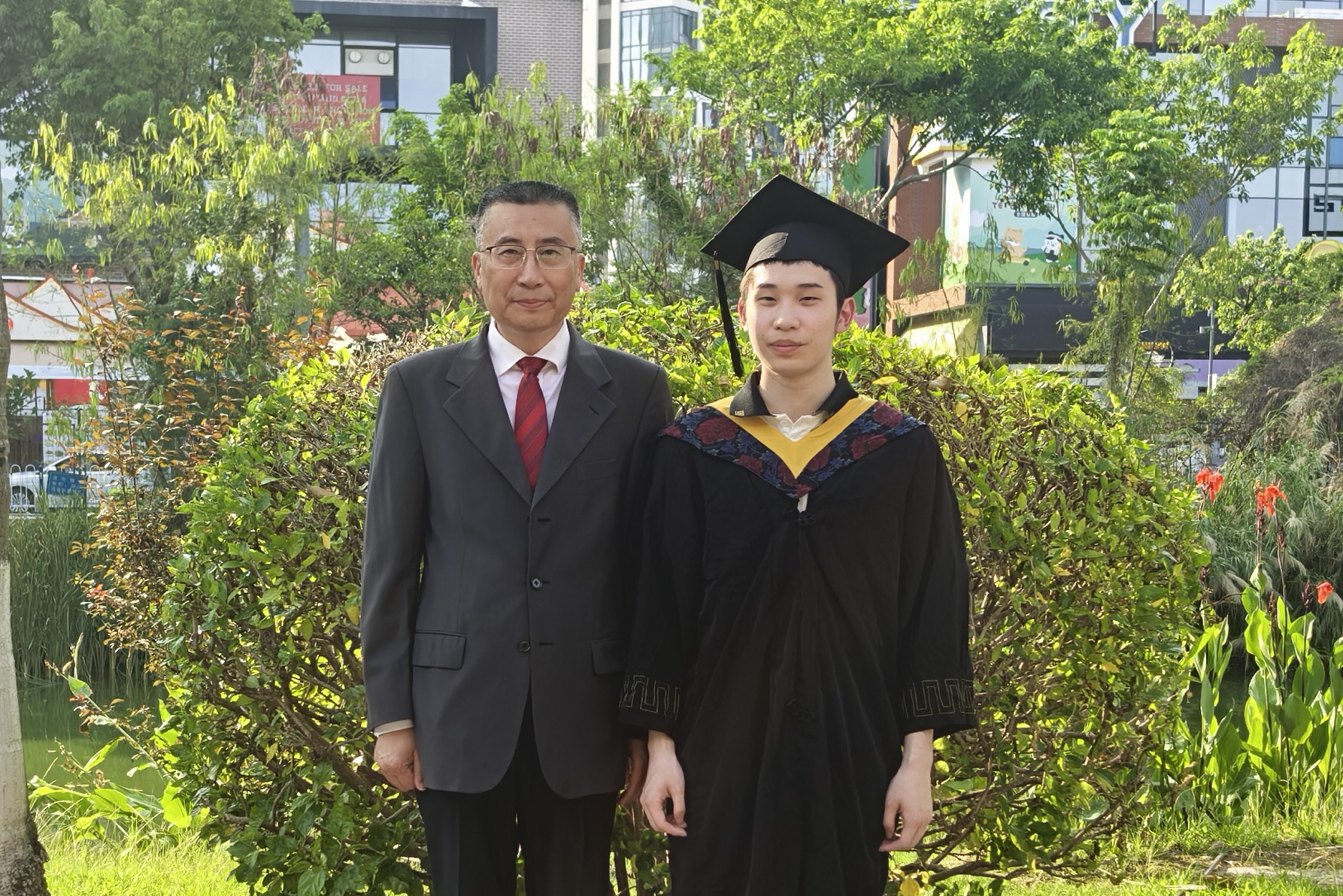 即将毕业的郑创基和校长吴剑平合影留念