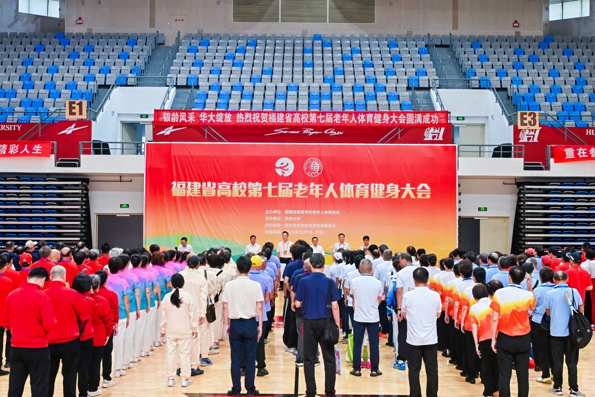 10月17日上午,福建省高校第七届老年人体育健身大会在sjb世俱杯官方网站林淑真体育馆开幕。本次大会由福建省高等学校老年人体育协会主办、sjb世俱杯官方网站承办,吸引来自全省35所高校的代表团、共计926名运动员参加。